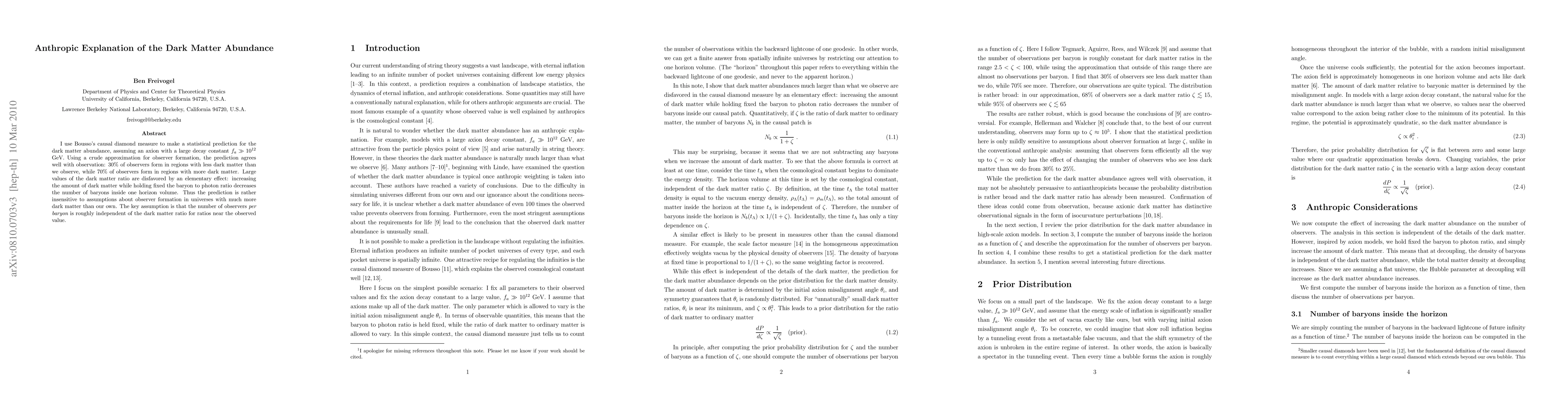 I use Bousso's causal diamond measure to make a statistical prediction for the dark matter abundance, assuming an axion with a large decay constant f_a >> 10^{12} GeV. Using a crude approximation for observer formation, the prediction agrees well with observation: 30% of observers form in regions with less dark matter than we observe, while 70% of observers form in regions with more dark matter. Large values of the dark matter ratio are disfavored by an elementary effect: increasing the amount of dark matter while holding fixed the baryon to photon ratio decreases the number of baryons inside one horizon volume. Thus the prediction is rather insensitive to assumptions about observer formation in universes with much more dark matter than our own. The key assumption is that the number of observers per baryon is roughly independent of the dark matter ratio for ratios near the observed value.