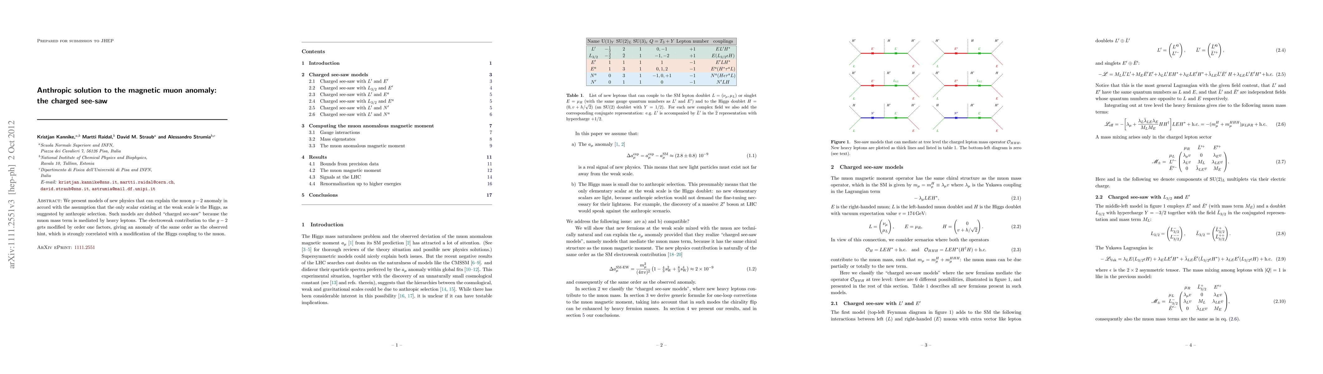 We present models of new physics that can explain the muon g-2 anomaly in accord with with the assumption that the only scalar existing at the weak scale is the Higgs, as suggested by anthropic selection. Such models are dubbed "charged see-saw" because the muon mass term is mediated by heavy leptons. The electroweak contribution to the g-2 gets modified by order one factors, giving an anomaly of the same order as the observed hint, which is strongly correlated with a modification of the Higgs coupling to the muon.