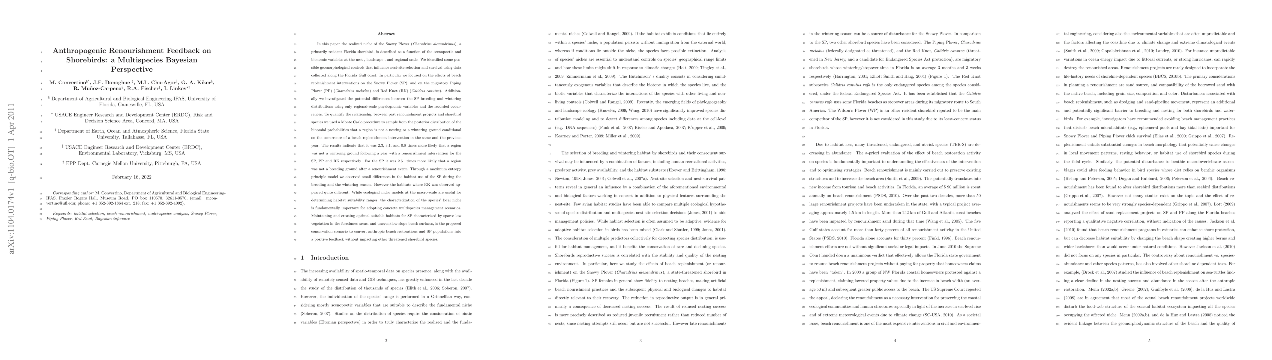 In this paper the realized niche of the Snowy Plover (Charadrius alexandrinus), a primarily resident Florida shorebird, is described as a function of the scenopoetic and bionomic variables at the nest-, landscape-, and regional-scale. We identified some pos- sible geomorphological controls that influence nest-site selection and survival using data collected along the Florida Gulf coast. In particular we focused on the effects of beach replenishment interventions on the Snowy Plover (SP), and on the migratory Piping Plover (PP) (Charadrius melodus) and Red Knot (RK) (Calidris canutus). To quantify the relationship between past renourishment projects and shorebird species we used a Monte Carlo procedure to sample from the posterior distribution of the binomial probabilities that a region is not a nesting or a wintering ground conditional on the occurrence of a beach replenishment intervention in the same and the previous year. The results indicate that it was 2.3, 3.1, and 0.8 times more likely that a region was not a wintering ground following a year with a renourishment intervention for the SP, PP and RK respectively. For the SP it was 2.5. times more likely that a region was not a breeding ground after a renourishment event. Through a maximum entropy principle model we observed small differences in the habitat use of the SP during the breeding and the wintering season. However the habitats where RK was observed ap- peared quite different. Maintaining and creating optimal suitable habitats for SP characterized by sparse low vegetation in the foredunes areas, and uneven/low-slope beach surfaces, is the proposed conservation scenario to convert anthropic beach restorations and SP populations into a positive feedback without impacting other threatened shorebird species.