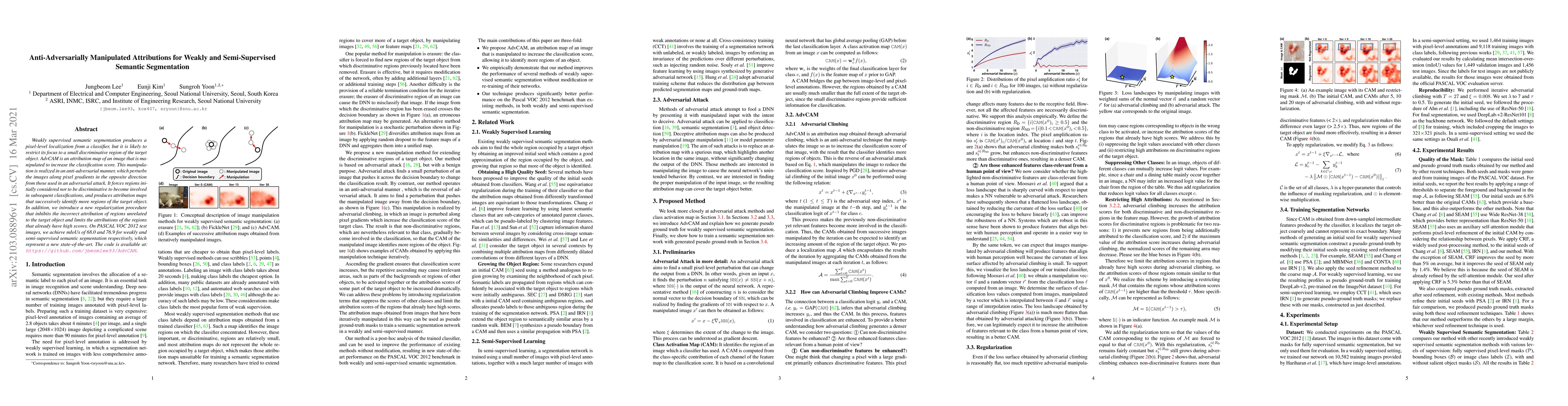 Weakly supervised semantic segmentation produces a pixel-level localization from a classifier, but it is likely to restrict its focus to a small discriminative region of the target object. AdvCAM is an attribution map of an image that is manipulated to increase the classification score. This manipulation is realized in an anti-adversarial manner, which perturbs the images along pixel gradients in the opposite direction from those used in an adversarial attack. It forces regions initially considered not to be discriminative to become involved in subsequent classifications, and produces attribution maps that successively identify more regions of the target object. In addition, we introduce a new regularization procedure that inhibits the incorrect attribution of regions unrelated to the target object and limits the attributions of the regions that already have high scores. On PASCAL VOC 2012 test images, we achieve mIoUs of 68.0 and 76.9 for weakly and semi-supervised semantic segmentation respectively, which represent a new state-of-the-art.