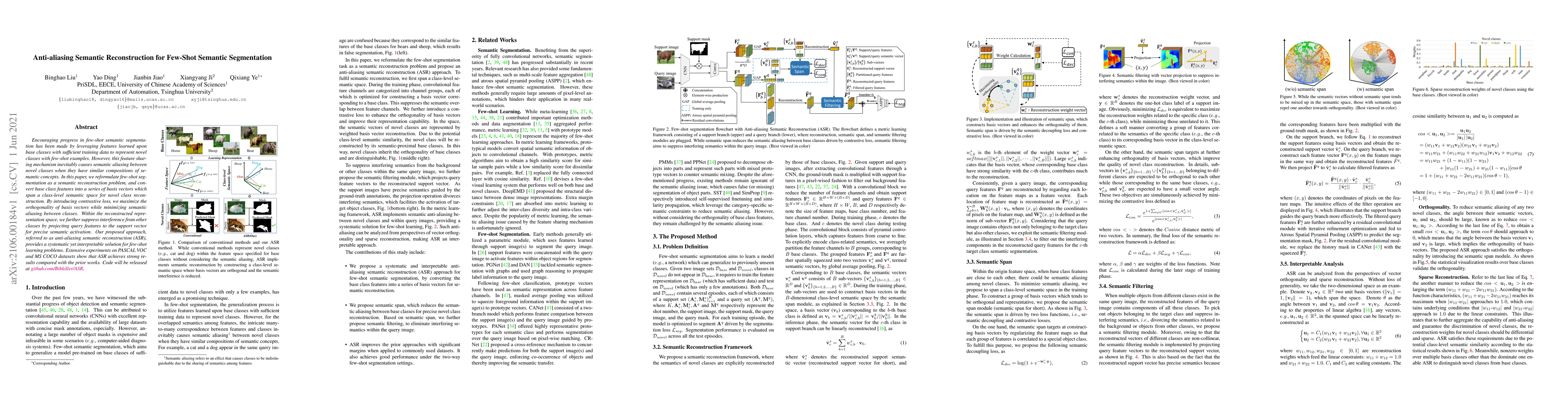 This paper proposes anti-aliasing semantic reconstruction (ASR) for few-shot semantic segmentation, reformulating the problem as a semantic reconstruction task to minimize aliasing between similar classes. ASR uses contrastive loss to maximize orthogonality of basis vectors and suppresses interference by projecting query features to support vectors, achieving superior performance on PASCAL VOC and MS COCO datasets.