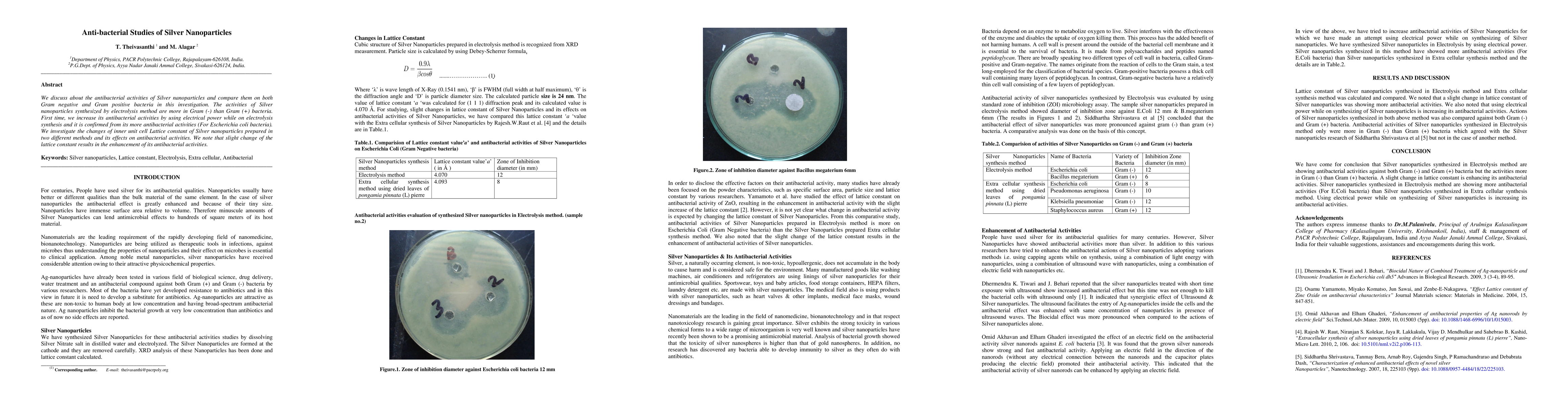We discuss about the antibacterial activities of Silver nanoparticles and compare them on both Gram negative and Gram positive bacteria in this investigation. The activities of Silver nanoparticles synthesized by electrolysis method are more in Gram (-) than Gram (+) bacteria. First time, we increase its antibacterial activities by using electrical power while on electrolysis synthesis and it is confirmed from its more antibacterial activities (For Escherichia coli bacteria). We investigate the changes of inner unit cell Lattice constant of Silver nanoparticles prepared in two different methods and its effects on antibacterial activities. We note that slight change of the lattice constant results in the enhancement of its antibacterial activities.