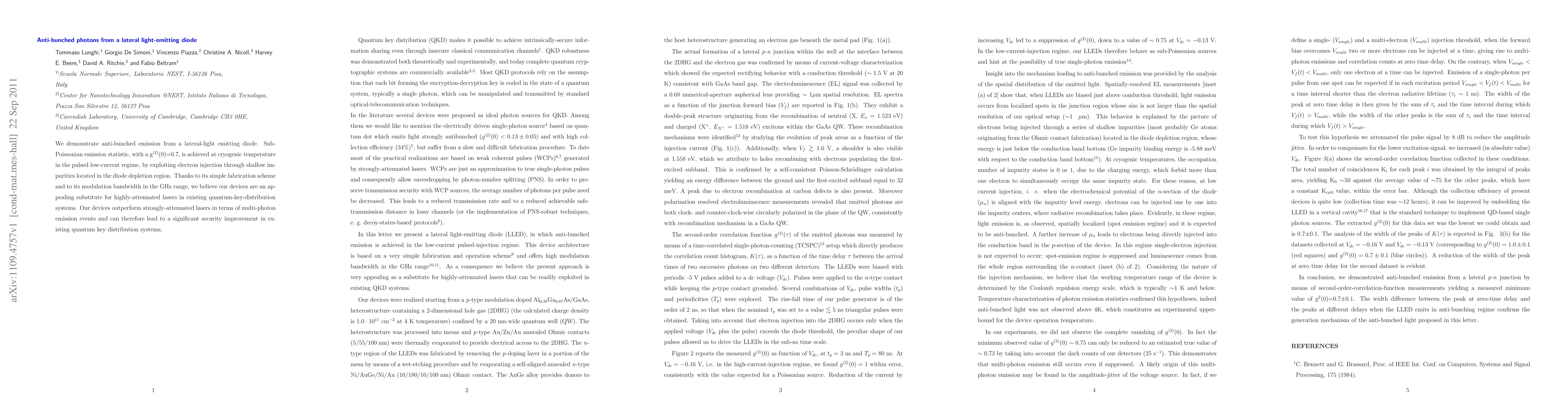 This paper demonstrates anti-bunched photon emission from a lateral light-emitting diode, achieving a sub-Poissonian emission statistic at cryogenic temperatures. The device, with a simple fabrication and GHz modulation bandwidth, offers a promising alternative to highly-attenuated lasers in quantum-key-distribution systems, enhancing security by reducing multi-photon emission events.