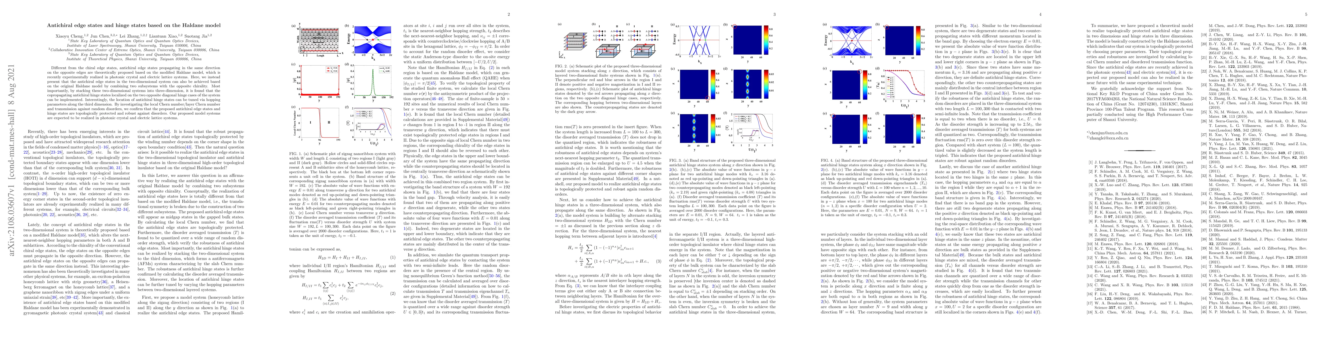 The paper proposes antichiral edge states in a modified Haldane model and demonstrates that they can also be achieved in the original model by combining two subsystems with opposite chirality. The study further reveals that stacking these systems into three dimensions creates copropagating antichiral hinge states, which can be tuned by hopping parameters and are topologically protected against random disorders.