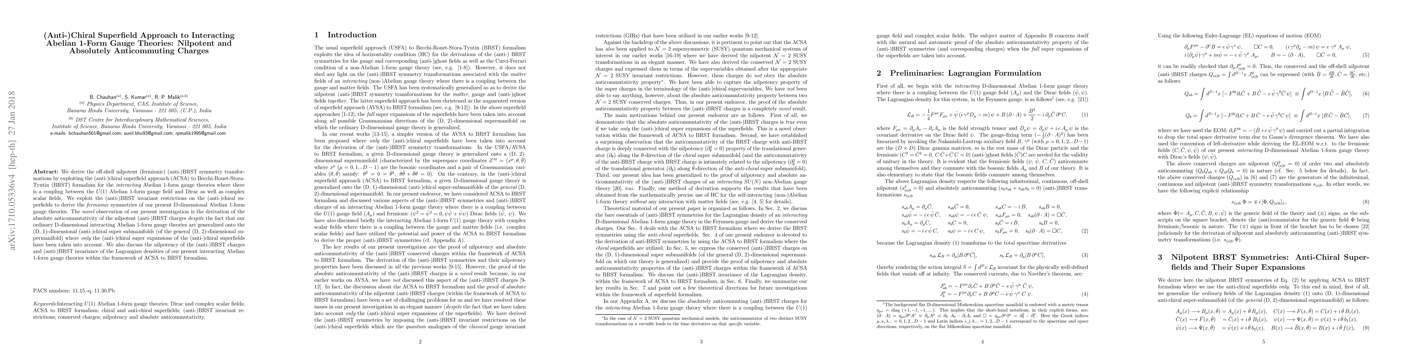 This paper explores the (anti-)chiral superfield approach to derive off-shell nilpotent (anti-)BRST transformations for interacting Abelian 1-form gauge theories. It highlights the absolute anticommutativity of the (anti-)BRST charges and discusses the nilpotency and invariance of the Lagrangian densities within the BRST formalism.