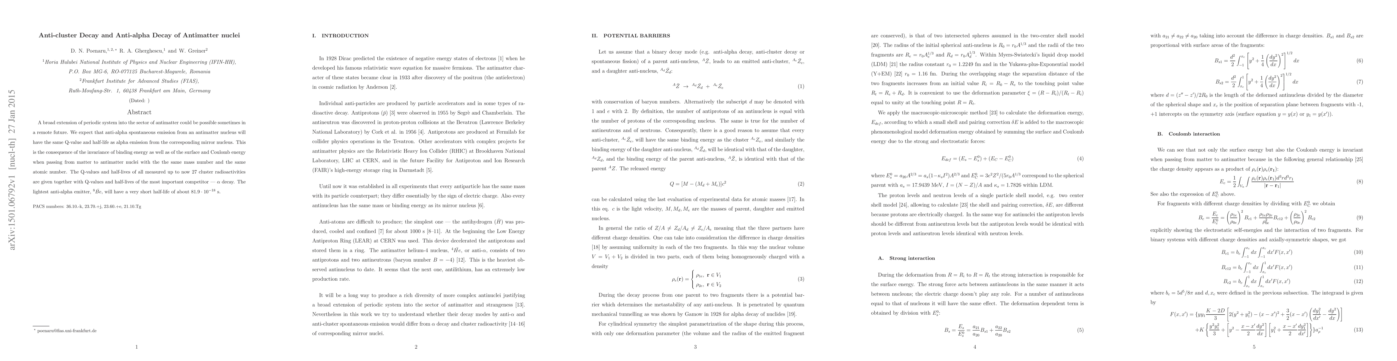 Researchers predict that antimatter nuclei will undergo anti-alpha decay with similar Q-values and half-lives as their matter counterparts, with the lightest anti-alpha emitter having a nearly unimaginably short half-life of 81.9 seconds.