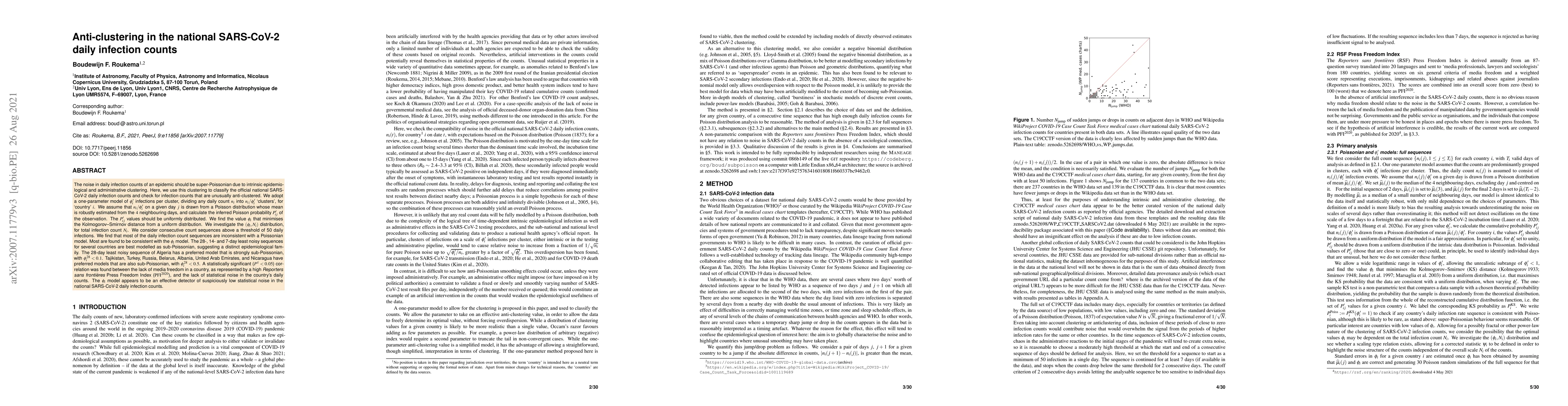 The noise in daily infection counts of an epidemic should be super-Poissonian due to intrinsic epidemiological and administrative clustering. Here, we use this clustering to classify the official national SARS-CoV-2 daily infection counts and check for infection counts that are unusually anti-clustered. We adopt a one-parameter model of $\phi'_i$ infections per cluster, dividing any daily count $n_i$ into $n_i/\phi'_i$ 'clusters', for 'country' $i$. We assume that $n_i/\phi'_i$ on a given day $j$ is drawn from a Poisson distribution whose mean is robustly estimated from the four neighbouring days, and calculate the inferred Poisson probability $P'_{ij}$ of the observation. The $P'_{ij}$ values should be uniformly distributed. We find the value $\phi_i$ that minimises the Kolmogorov-Smirnov distance from a uniform distribution. We investigate the $(\phi_i, N_i)$ distribution, for total infection count $N_i$. We find that most of the daily infection count sequences are inconsistent with a Poissonian model. Most are found to be consistent with the $\phi_i$ model. The 28-, 14- and 7-day least noisy sequences for several countries are best modelled as sub-Poissonian, suggesting a distinct epidemiological family. The 28-day least noisy sequence of Algeria has a preferred model that is strongly sub-Poissonian, with $\phi_i^{28} < 0.1$. TJ, TR, RU, BY, AL, AE, and NI have preferred models that are also sub-Poissonian, with $\phi_i^{28} < 0.5$. A statistically significant ($P^{\tau} < 0.05$) correlation was found between the lack of media freedom in a country, as represented by a high Reporters sans frontieres Press Freedom Index (PFI$^{2020}$), and the lack of statistical noise in the country's daily counts. The $\phi_i$ model appears to be an effective detector of suspiciously low statistical noise in the national SARS-CoV-2 daily infection counts.