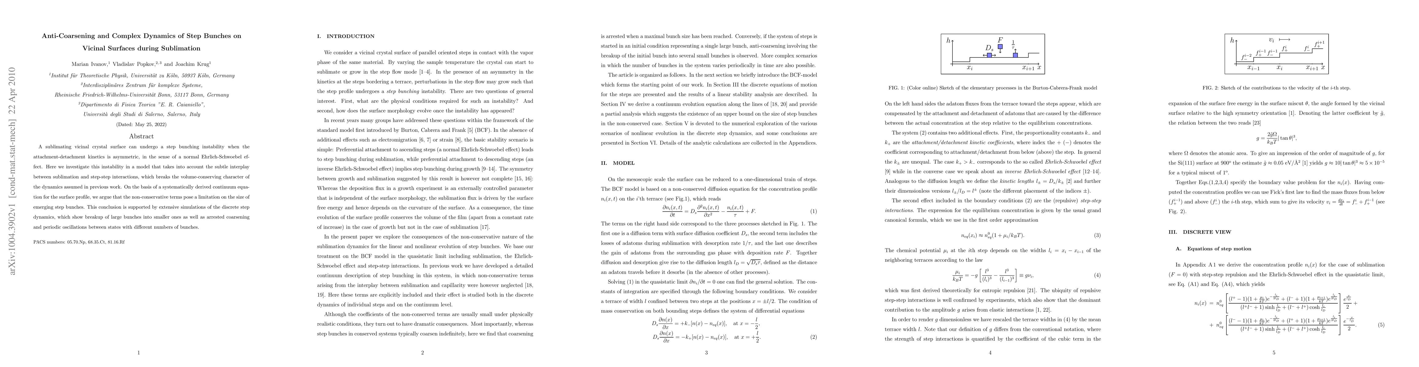 This paper investigates the step bunching instability on sublimating vicinal crystal surfaces, focusing on the interplay between sublimation and step-step interactions. The study reveals that non-conservative dynamics limit the size of step bunches, leading to breakup of large bunches, arrested coarsening, and periodic oscillations between different bunch states.