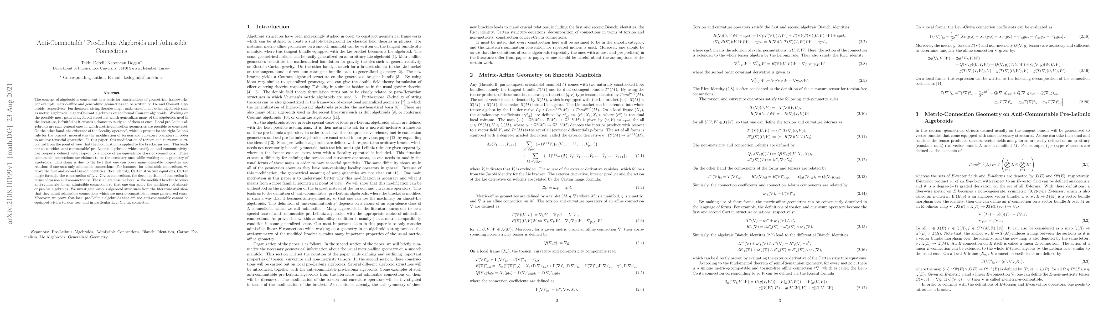 This paper introduces "anti-commutable" pre-Leibniz algebroids with modified torsion and curvature operators to facilitate metric-connection geometries. It shows that these structures admit "admissible" connections, enabling the proof of several geometric properties and the construction of Levi-Civita connections.