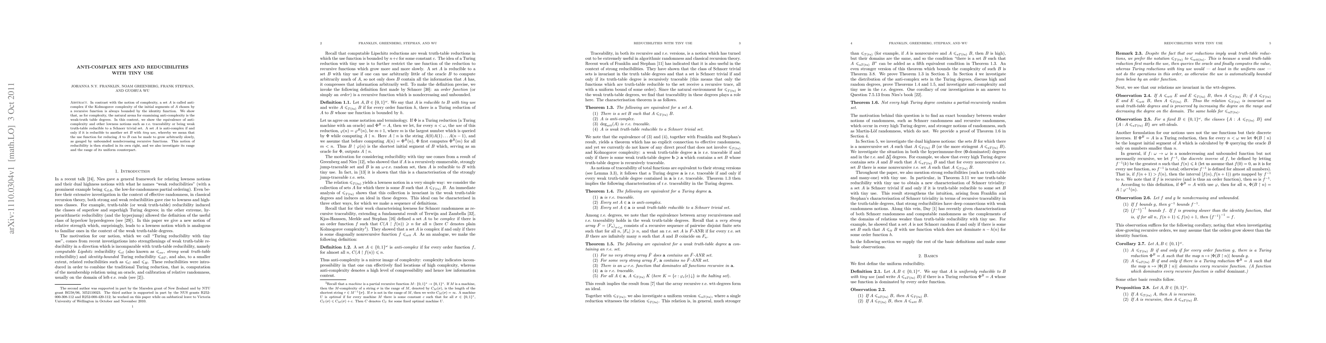 In contrast with the notion of complexity, a set $A$ is called anti-complex if the Kolmogorov complexity of the initial segments of $A$ chosen by a recursive function is always bounded by the identity function. We show that, as for complexity, the natural arena for examining anti-complexity is the weak-truth table degrees. In this context, we show the equivalence of anti-complexity and other lowness notions such as r.e.\ traceability or being weak truth-table reducible to a Schnorr trivial set. A set $A$ is anti-complex if and only if it is reducible to another set $B$ with \emph{tiny use}, whereby we mean that the use function for reducing $A$ to $B$ can be made to grow arbitrarily slowly, as gauged by unbounded nondecreasing recursive functions. This notion of reducibility is then studied in its own right, and we also investigate its range and the range of its uniform counterpart.