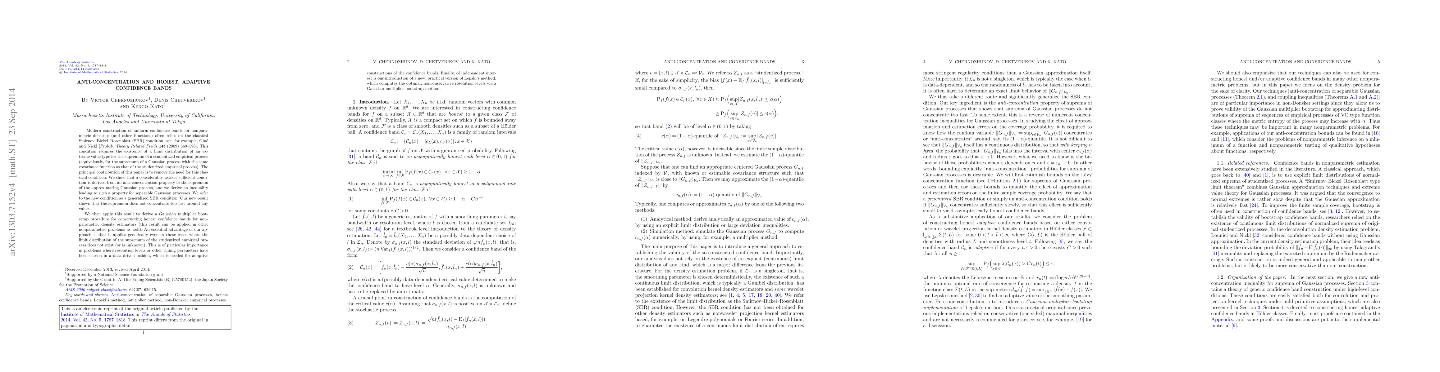 Modern construction of uniform confidence bands for nonparametric densities (and other functions) often relies on the classical Smirnov-Bickel-Rosenblatt (SBR) condition; see, for example, Gin\'{e} and Nickl [Probab. Theory Related Fields 143 (2009) 569-596]. This condition requires the existence of a limit distribution of an extreme value type for the supremum of a studentized empirical process (equivalently, for the supremum of a Gaussian process with the same covariance function as that of the studentized empirical process). The principal contribution of this paper is to remove the need for this classical condition. We show that a considerably weaker sufficient condition is derived from an anti-concentration property of the supremum of the approximating Gaussian process, and we derive an inequality leading to such a property for separable Gaussian processes. We refer to the new condition as a generalized SBR condition. Our new result shows that the supremum does not concentrate too fast around any value. We then apply this result to derive a Gaussian multiplier bootstrap procedure for constructing honest confidence bands for nonparametric density estimators (this result can be applied in other nonparametric problems as well). An essential advantage of our approach is that it applies generically even in those cases where the limit distribution of the supremum of the studentized empirical process does not exist (or is unknown). This is of particular importance in problems where resolution levels or other tuning parameters have been chosen in a data-driven fashion, which is needed for adaptive constructions of the confidence bands. Finally, of independent interest is our introduction of a new, practical version of Lepski's method, which computes the optimal, nonconservative resolution levels via a Gaussian multiplier bootstrap method.