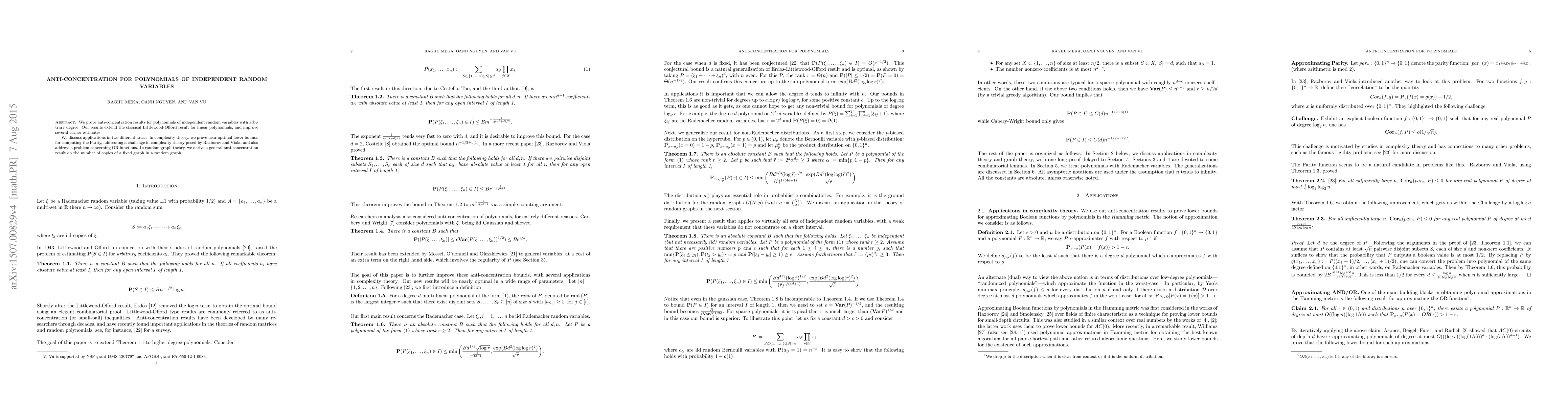 This paper establishes anti-concentration results for polynomials of independent random variables, extending classical Littlewood-Offord theorems and improving prior estimates. Applications include near-optimal lower bounds for computing Parity in complexity theory and an anti-concentration result for fixed graph copies in random graph theory.