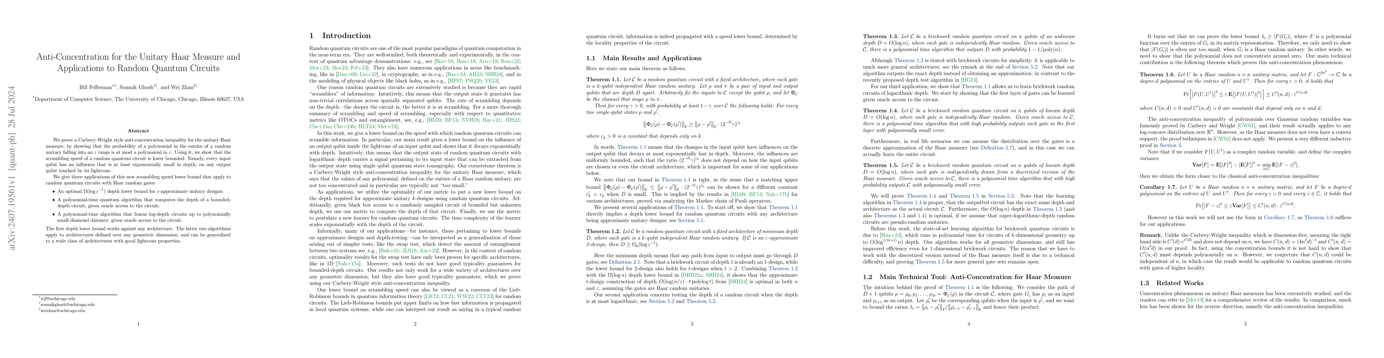 Summary: This paper establishes an anti-concentration inequality for the unitary Haar measure, proving a lower bound on the scrambling speed of random quantum circuits. It applies this result to demonstrate optimal depth lower bounds for unitary designs and presents quantum and learning algorithms for bounded-depth circuits across various architectures.