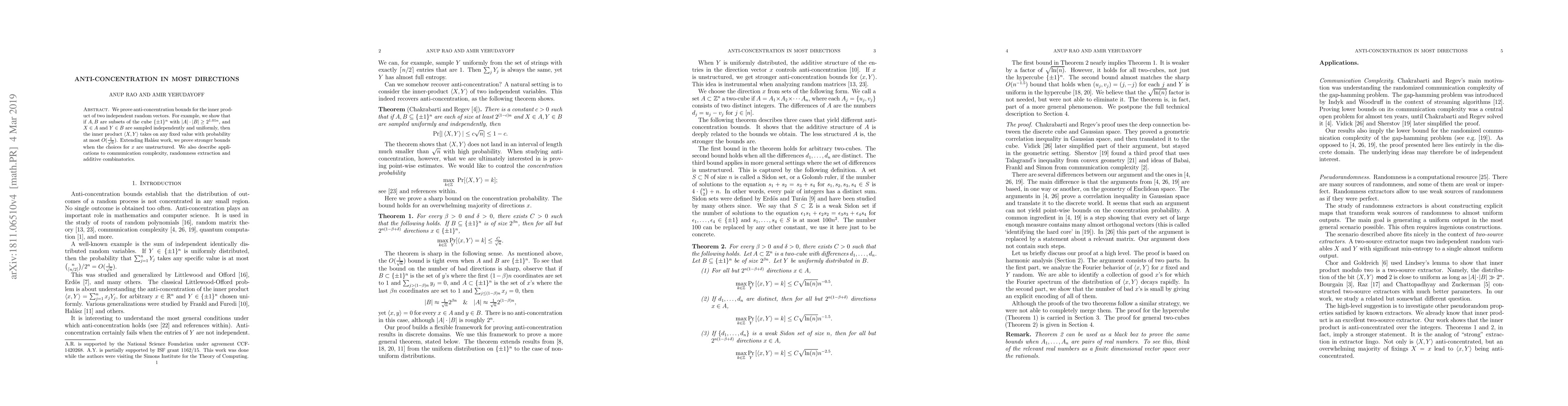 The paper proves anti-concentration bounds for the inner product of two random vectors, demonstrating that unstructured choices yield stronger bounds. It applies these findings to communication complexity, randomness extraction, and additive combinatorics, showing that the inner product takes fixed values with probability at most O(1/√n) under certain conditions.