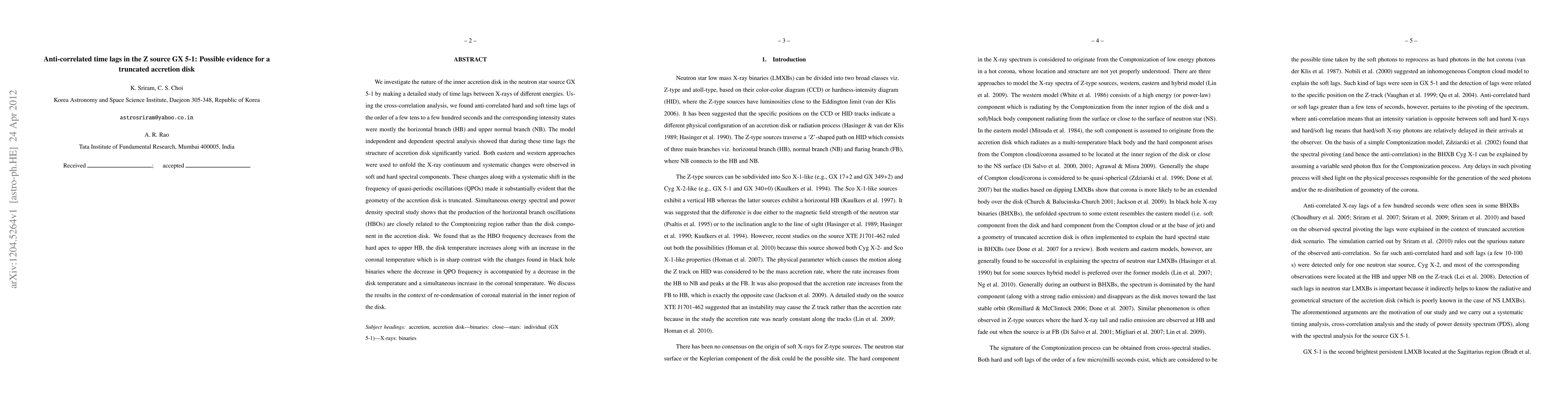 This study found evidence for a truncated accretion disk in neutron star source GX 5-1 based on anti-correlated time lags between X-ray energies, suggesting significant changes in the accretion disk's geometry and temperature.