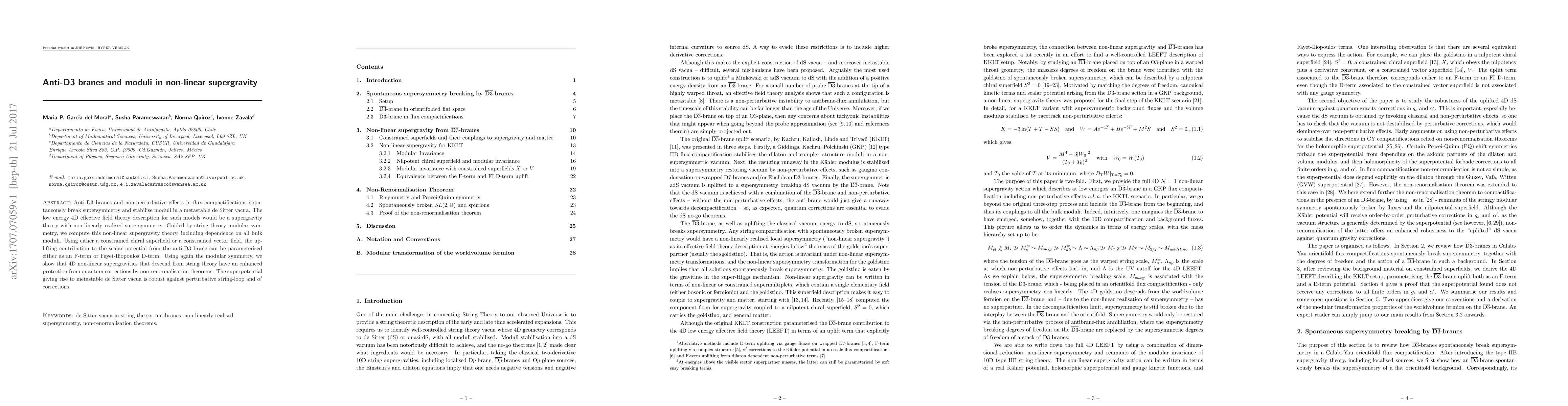 Anti-D3 branes and non-perturbative effects in flux compactifications spontaneously break supersymmetry and stabilise moduli in a metastable de Sitter vacua. The low energy 4D effective field theory description for such models would be a supergravity theory with non-linearly realised supersymmetry. Guided by string theory modular symmetry, we compute this non-linear supergravity theory, including dependence on all bulk moduli. Using either a constrained chiral superfield or a constrained vector field, the uplifting contribution to the scalar potential from the anti-D3 brane can be parameterised either as an F-term or Fayet-Iliopoulos D-term. Using again the modular symmetry, we show that 4D non-linear supergravities that descend from string theory have an enhanced protection from quantum corrections by non-renormalisation theorems. The superpotential giving rise to metastable de Sitter vacua is robust against perturbative string-loop and $\alpha'$ corrections.