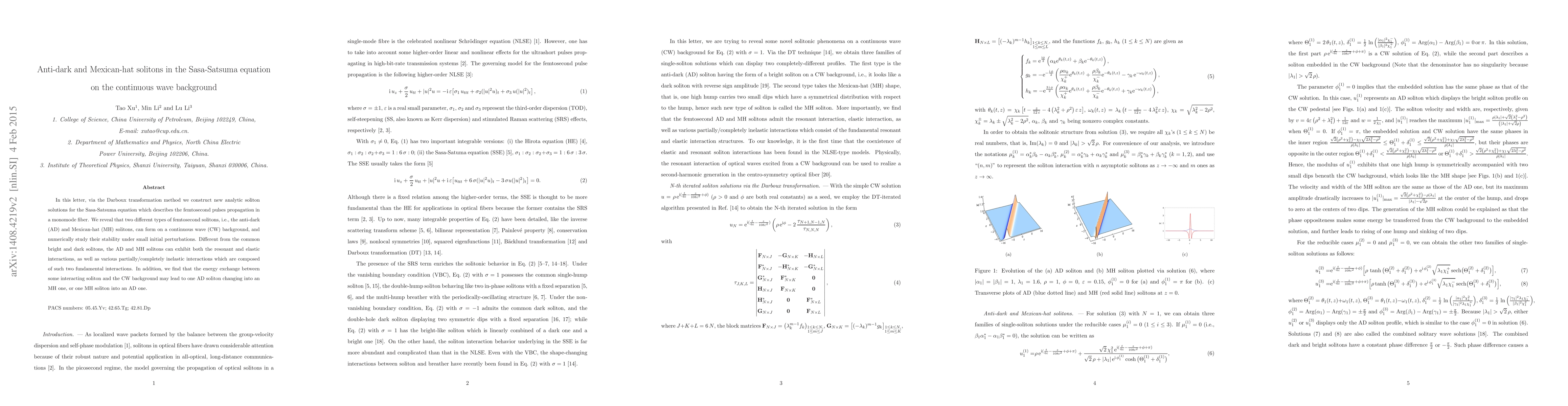 This paper constructs new soliton solutions—anti-dark and Mexican-hat solitons—for the Sasa-Satsuma equation using the Darboux transformation method. It explores their stability and interactions, revealing unique resonant, elastic, and inelastic behaviors, and energy exchange dynamics with a continuous wave background.