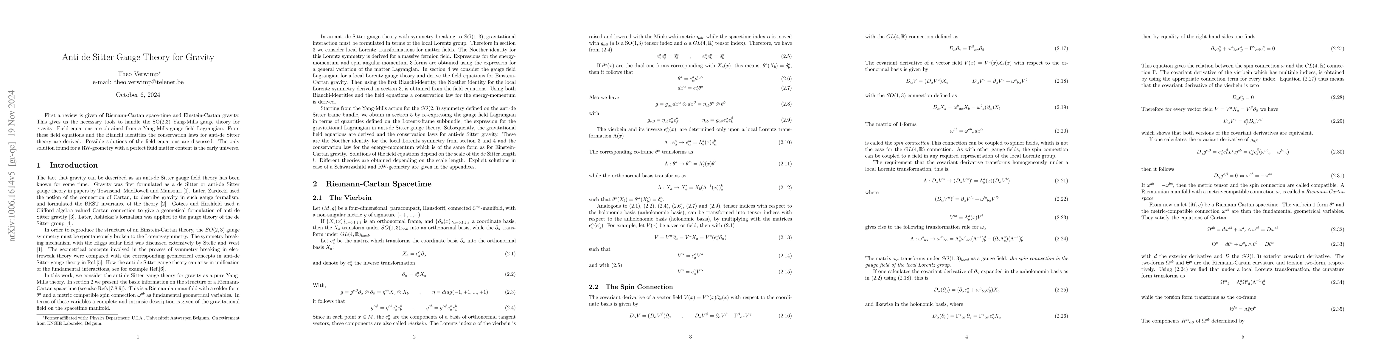 The paper reviews Riemann-Cartan space-time and Einstein-Cartan gravity to establish SO(2,3) Yang-Mills gauge theory for gravity, deriving conservation laws and discussing field equation solutions, particularly in Schwarzschild and FRW geometries in anti-de Sitter space.