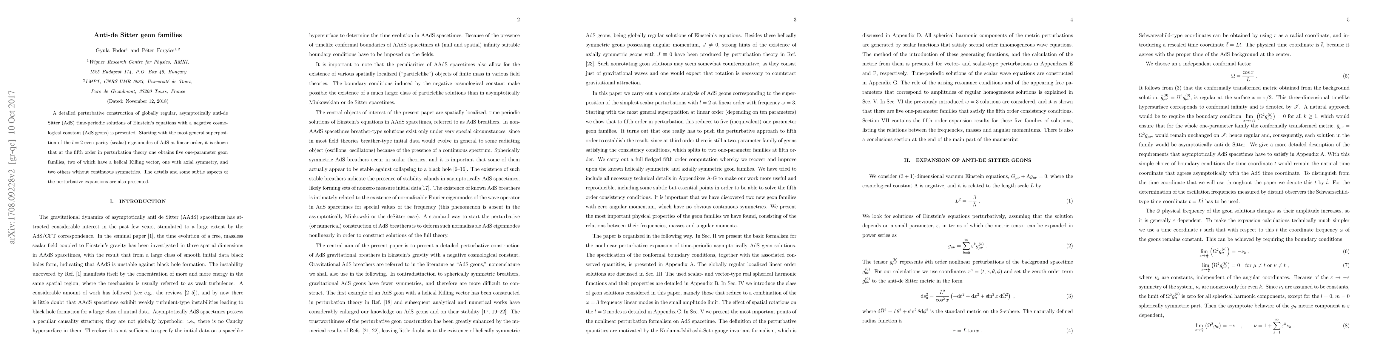 This research presents a detailed method for constructing globally regular, asymptotically anti-de Sitter (AdS) time-periodic solutions of Einstein's equations, known as AdS geons. Using perturbation theory up to the fifth order, five one-parameter geon families are derived, including those with helical and axial symmetries, as well as those without continuous symmetries.