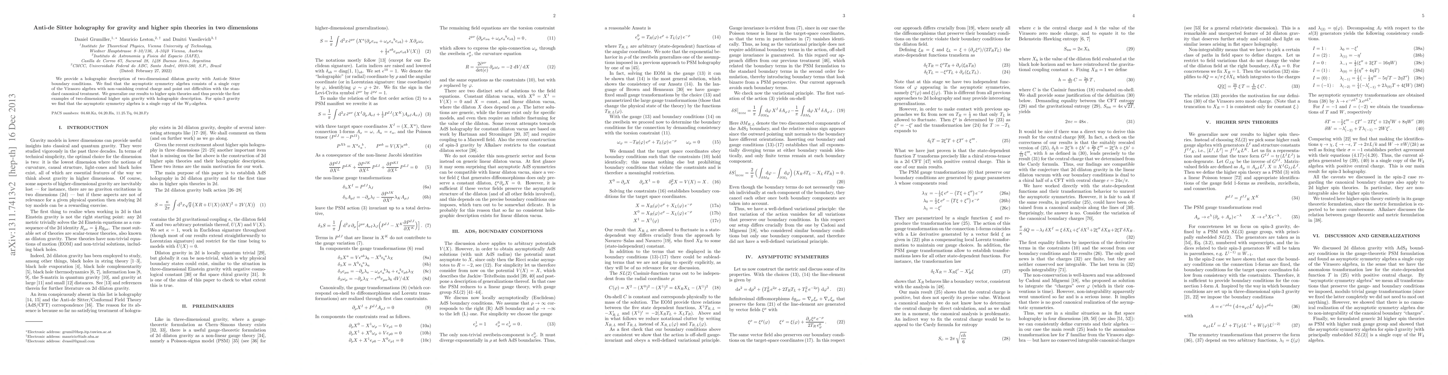 This paper presents a holographic description of two-dimensional dilaton gravity under Anti-de Sitter boundary conditions, revealing an asymptotic symmetry algebra of the Virasoro algebra with a non-vanishing central charge. It extends these findings to higher spin theories, providing the first holographic examples of two-dimensional higher spin gravity, including the W_3-algebra for spin-3 gravity.