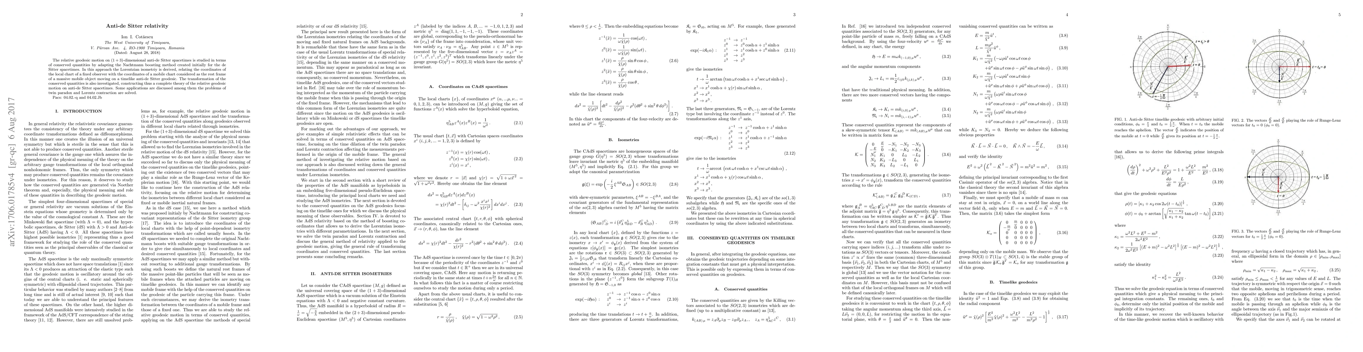 The relative geodesic motion on $(1+3)$-dimensional anti-de Sitter spacetimes is studied in terms of conserved quantities by adapting the Nachtmann boosting method created initially for the de Sitter spacetimes. In this approach the Lorentzian isometriy is derived, relating the coordinates of the local chart of a fixed observer with the coordinates of a mobile chart considered as the rest frame of a massive mobile object moving on a timelike anti-de Sitter geodesic. The transformation of the conserved quantities is also investigated, constructing thus a complete theory of the relative geodesic motion on anti-de Sitter spacetimes. Some applications are discussed among them the problems of twin paradox and Lorentz contraction are solved.