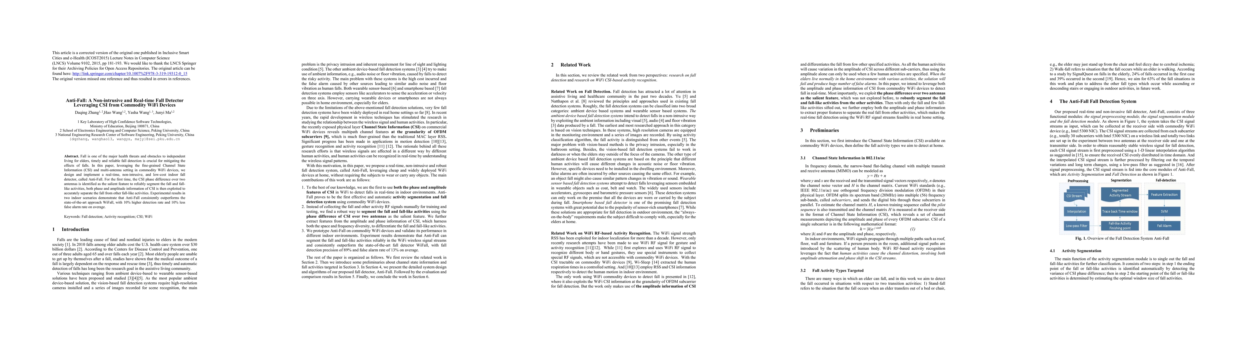Anti-Fall is a real-time, non-intrusive fall detector using Channel State Information (CSI) from commodity WiFi devices, achieving higher detection rates and lower false alarm rates compared to existing methods. The system leverages CSI phase differences to distinguish falls from other activities.