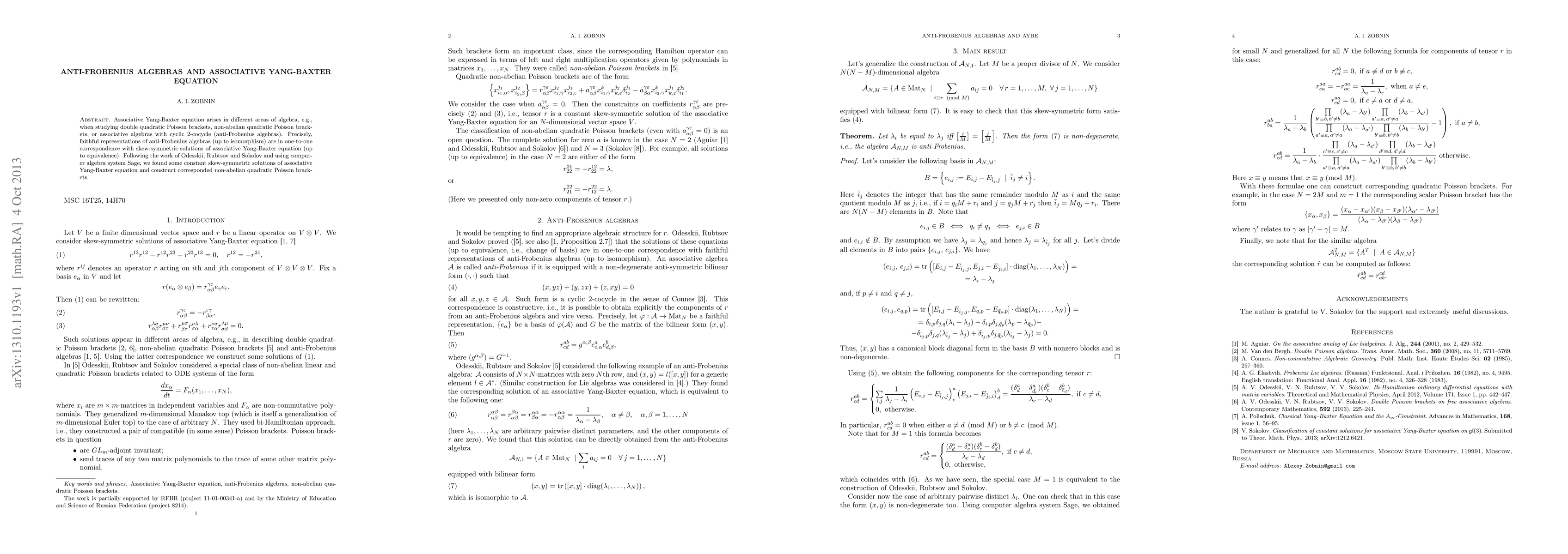 Associative Yang-Baxter equation arises in different areas of algebra, e.g., when studying double quadratic Poisson brackets, non-abelian quadratic Poisson brackets, or associative algebras with cyclic 2-cocycle (anti-Frobenius algebras). Precisely, faithful representations of anti-Frobenius algebras (up to isomorphism) are in one-to-one correspondence with skew-symmetric solutions of associative Yang-Baxter equation (up to equivalence). Following the work of Odesskii, Rubtsov and Sokolov and using computer algebra system Sage, we found some constant skew-symmetric solutions of associative Yang-Baxter equation and construct corresponded non-abelian quadratic Poisson brackets.