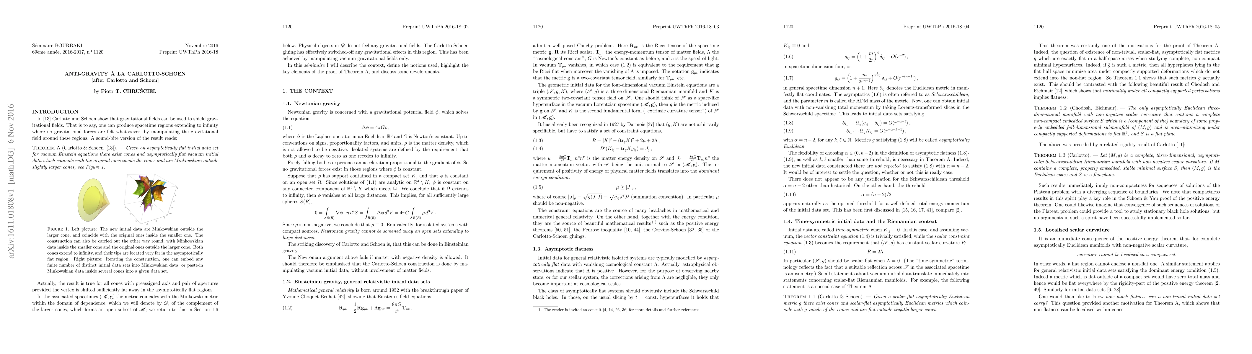 We review the Carlotto-Schoen construction of general relativistic initial data sets which are trivial outside of cones, discuss the context, the implications, and some further developments.