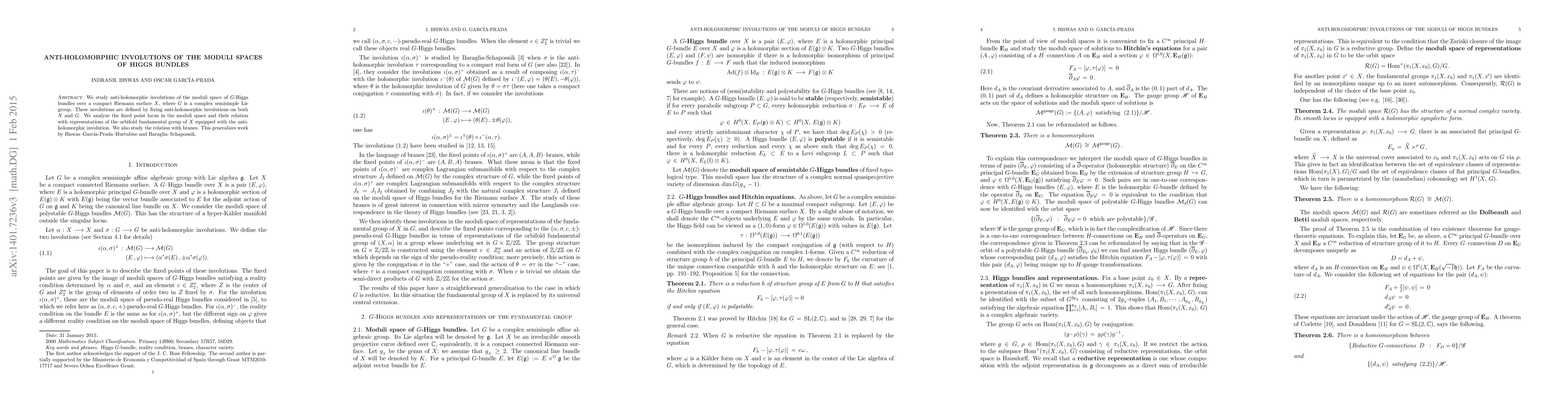 The paper investigates anti-holomorphic involutions on the moduli space of $G$-Higgs bundles over a compact Riemann surface $X$, examining their fixed points and connections to representations of the orbifold fundamental group. It also explores their relation to branes, extending previous work by Biswas-García-Prada-Hurtubise and Baraglia-Schaposnik.