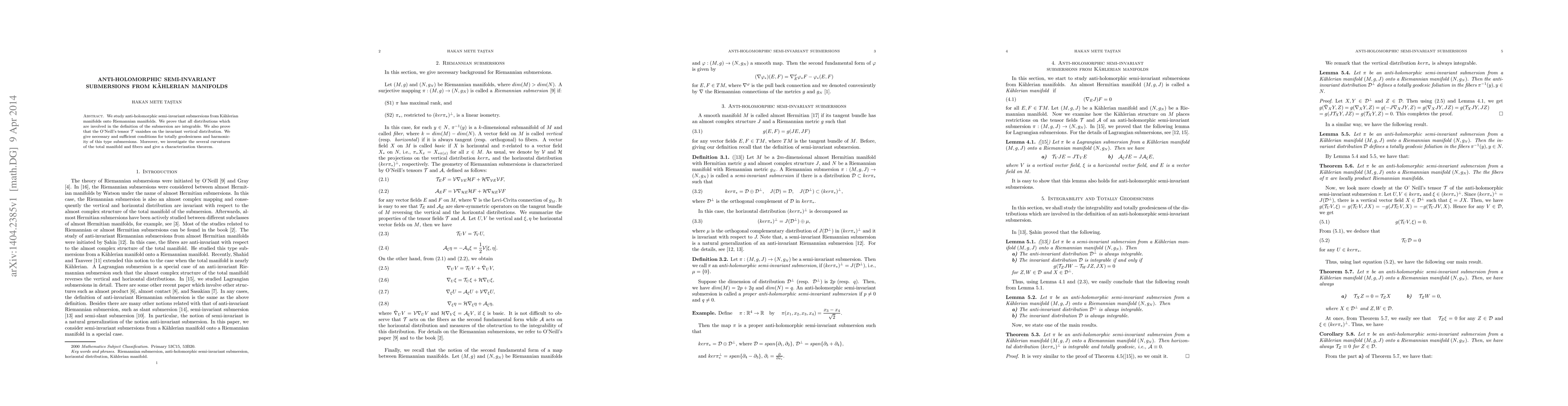 This paper investigates anti-holomorphic semi-invariant submersions from Kählerian manifolds to Riemannian manifolds, proving the integrability of involved distributions and the vanishing of O'Neill's tensor on the invariant vertical distribution. It also provides necessary and sufficient conditions for the submersions' totally geodesicness and harmonicity, along with a characterization of their curvatures.
