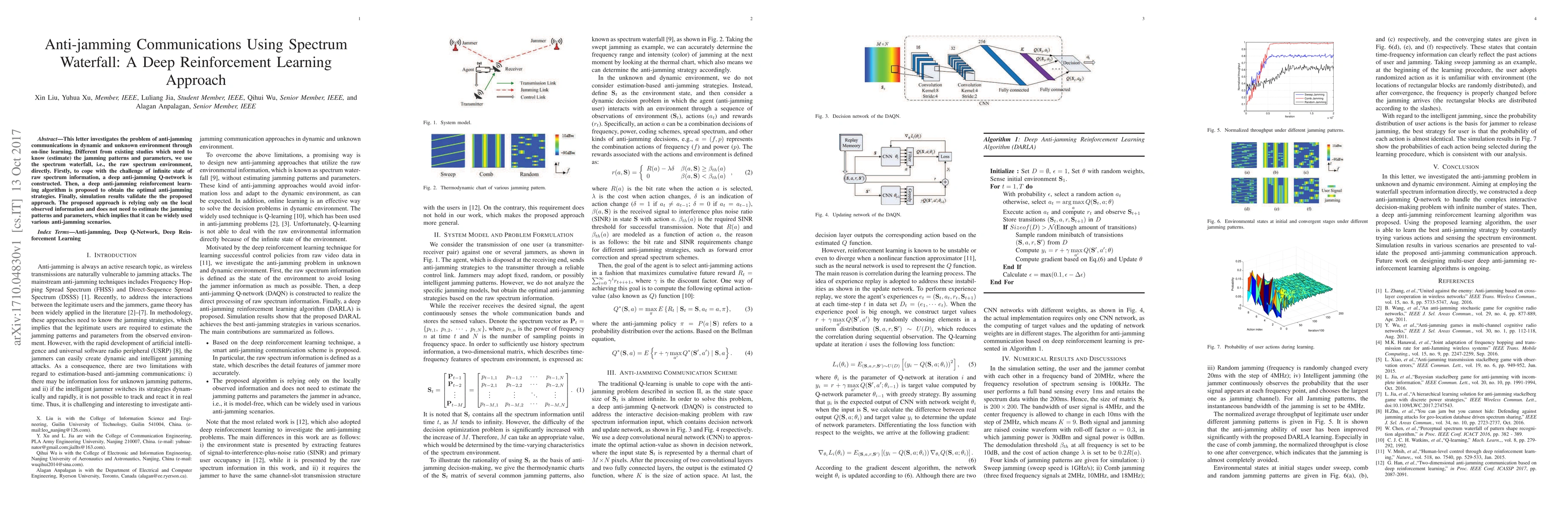 This paper proposes a deep reinforcement learning approach for anti-jamming communications using spectrum waterfall without requiring prior knowledge of jamming patterns. The method employs a deep anti-jamming Q-network and a reinforcement learning algorithm to derive optimal strategies based on local observed spectrum data.