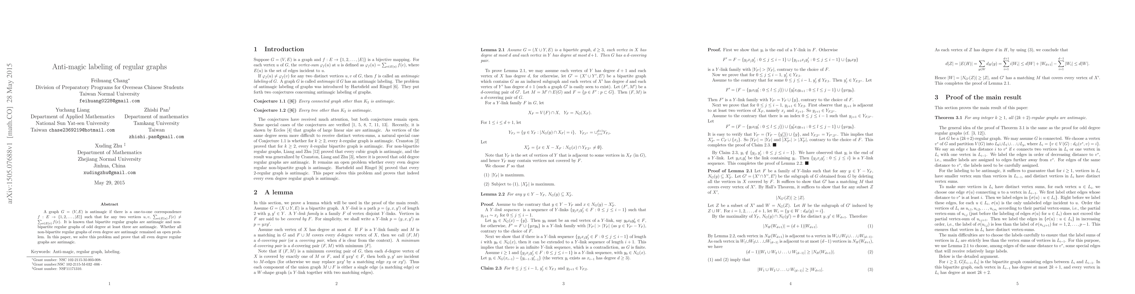 This paper resolves the open problem regarding antimagic labeling of regular graphs, proving that all regular graphs with even degrees, including non-bipartite ones, possess an antimagic labeling. This extends the known antimagic properties to a broader class of graphs.