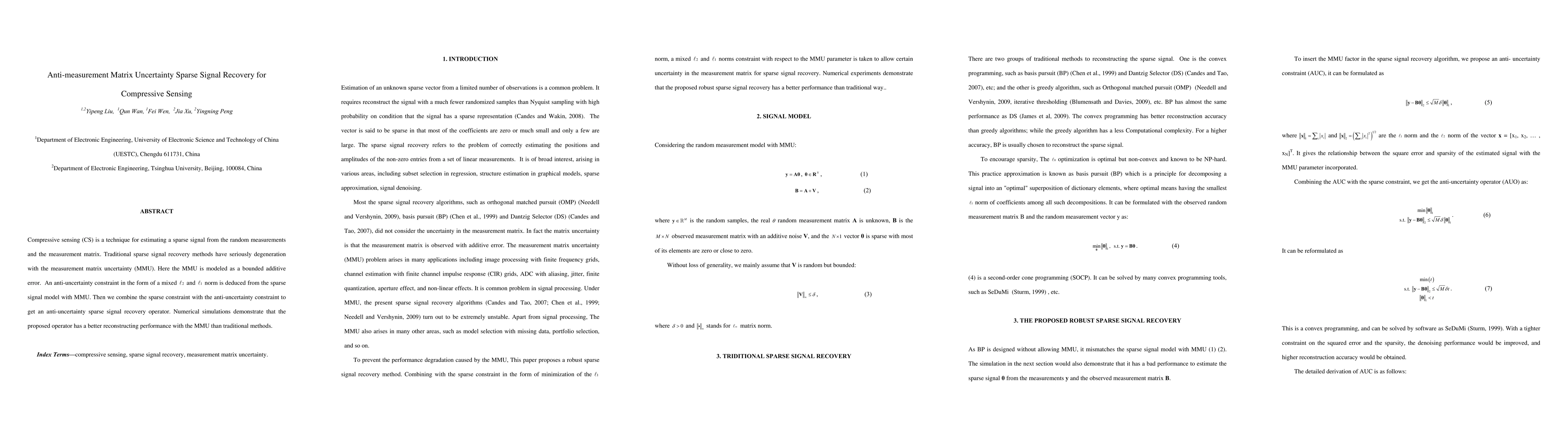 This paper proposes an anti-uncertainty sparse signal recovery operator for compressive sensing that incorporates an anti-uncertainty constraint to handle measurement matrix uncertainty. Numerical simulations show improved reconstruction performance compared to traditional methods.