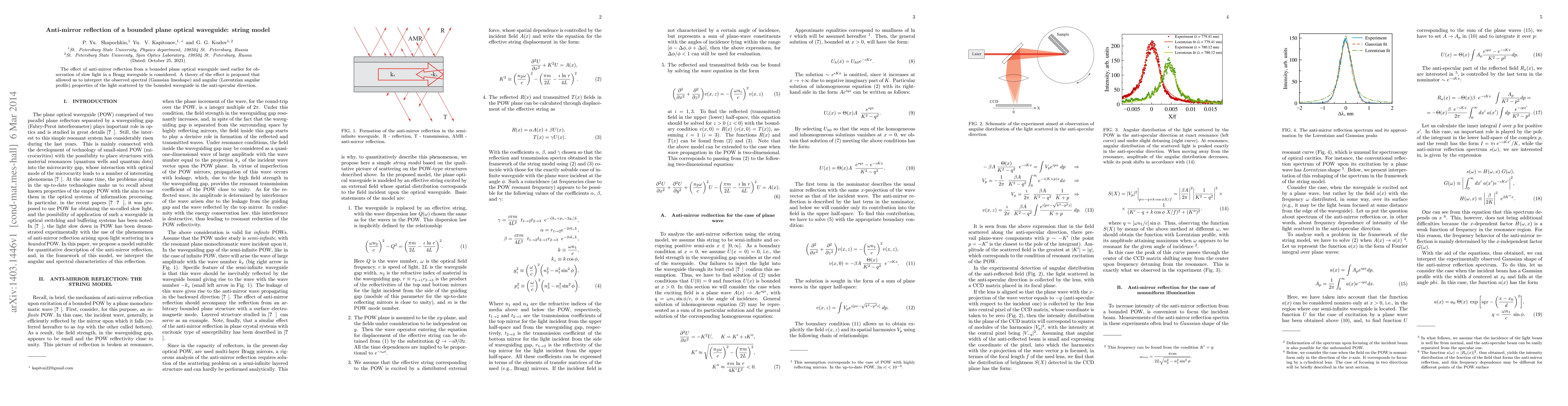 The paper proposes a theory to explain anti-mirror reflection in a bounded plane optical waveguide, correlating it with observed spectral and angular properties of scattered light in the anti-specular direction. The findings interpret the Gaussian lineshape and Lorentzian angular profile observed in the scattered light.