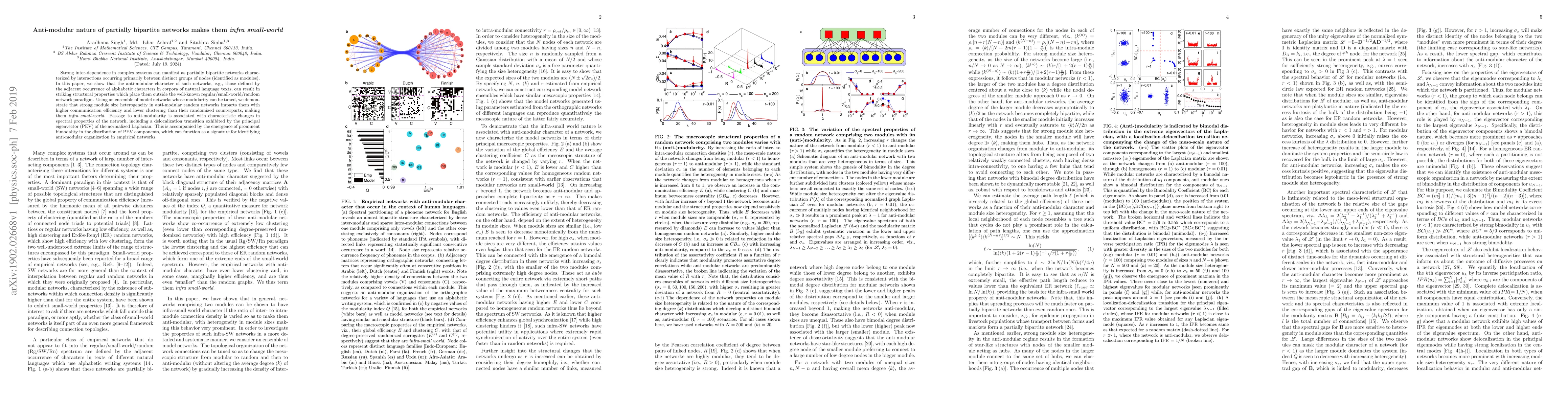 Strong inter-dependence in complex systems can manifest as partially bipartite networks characterized by interactions occurring primarily between distinct groups of nodes (identified as modules). In this paper, we show that the anti-modular character of such networks, e.g., those defined by the adjacent occurrence of alphabetic characters in corpora of natural language texts, can result in striking structural properties which place them outside the well-known regular/small-world/random network paradigm. Using an ensemble of model networks whose modularity can be tuned, we demonstrate that strong module size heterogeneity in anti-modular random networks imparts them with higher communication efficiency and lower clustering than their randomized counterparts, making them infra small-world. Passage to anti-modularity is associated with characteristic changes in spectral properties of the network, including a delocalization transition exhibited by the principal eigenvector (PEV) of the normalized Laplacian. This is accompanied by the emergence of prominent bimodality in the distribution of PEV components, which can function as a signature for identifying anti-modular organization in empirical networks.