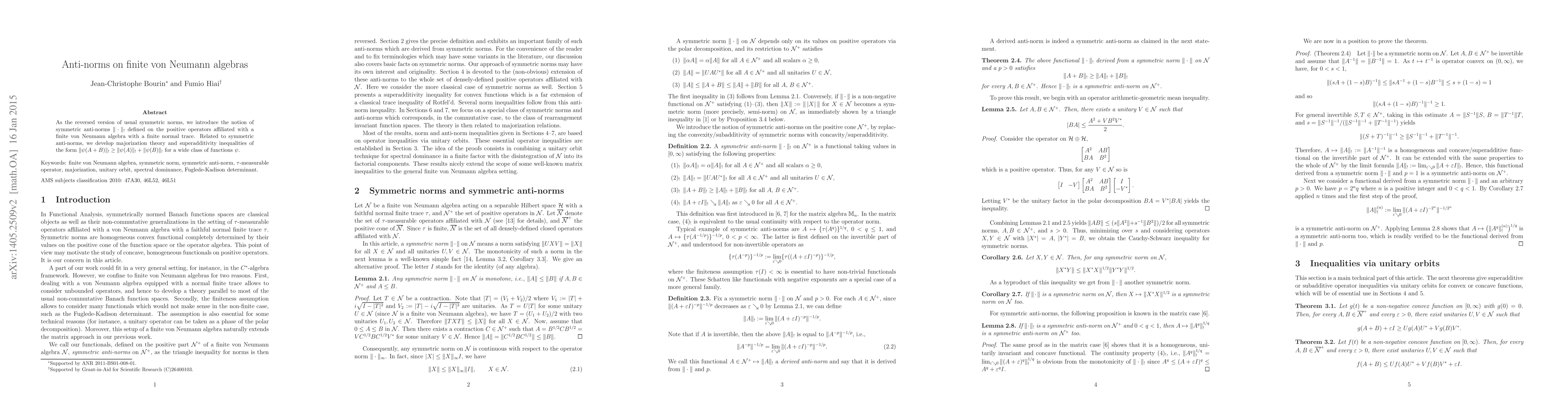 As the reversed version of usual symmetric norms, we introduce the notion of symmetric anti-norms $\|\cdot\|_!$ defined on the positive operators affiliated with a finite von Neumann algebra with a finite normal trace. Related to symmetric anti-norms, we develop majorization theory and superadditivity inequalities of the form $\|\psi(A+B)\|_!\ge\|\psi(A)\|_!+\|\psi(B)\|_!$ for a wide class of functions $\psi$.