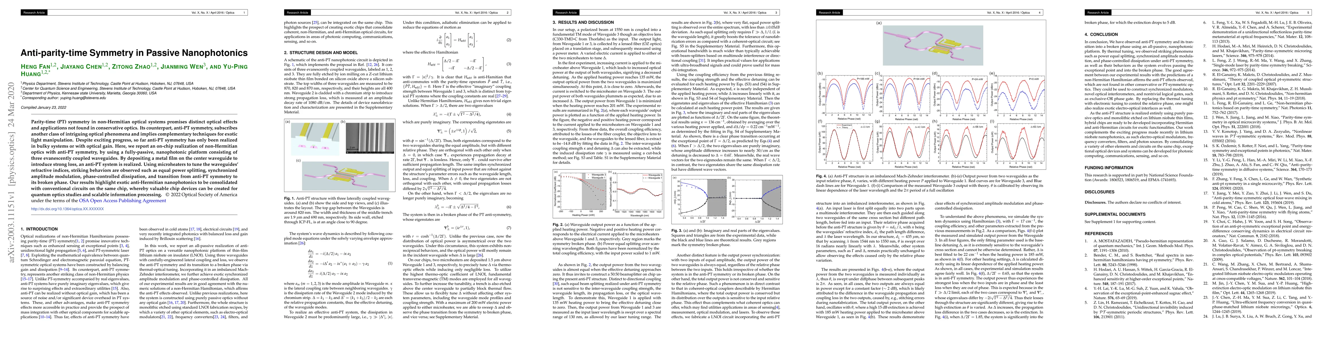 This paper reports on-chip realization of non-Hermitian optics with anti-parity-time symmetry in a fully passive nanophotonic platform, demonstrating behaviors like equal power splitting and phase-controlled dissipation. The findings suggest potential for integrating exotic anti-Hermitian nanophotonics with conventional circuits for quantum optics and information processing.