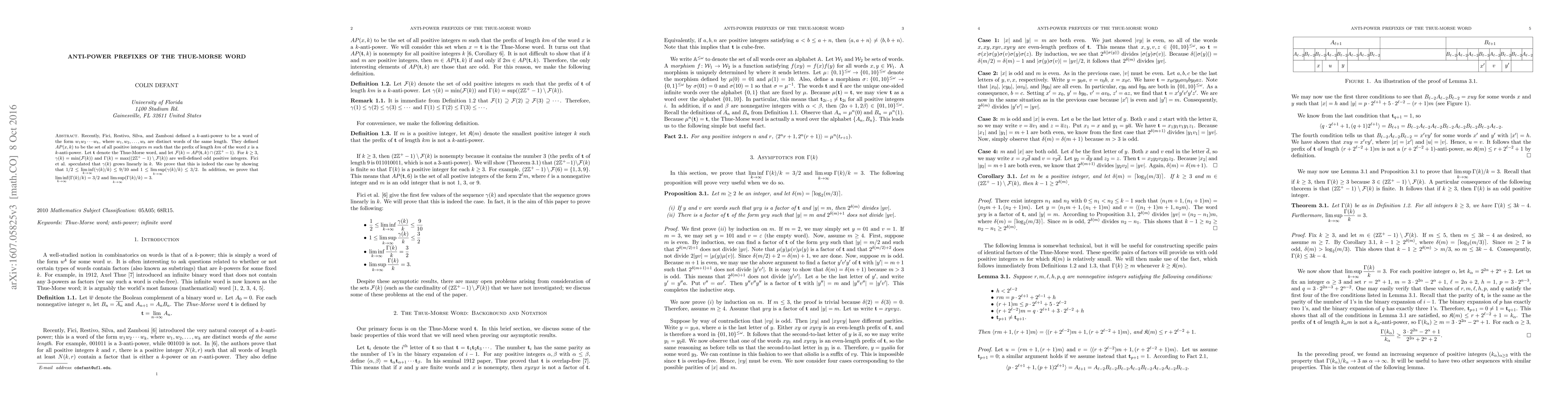 Recently, Fici, Restivo, Silva, and Zamboni defined a $k$-anti-power to be a word of the form $w_1w_2\cdots w_k$, where $w_1,w_2,\ldots,w_k$ are distinct words of the same length. They defined $AP(x,k)$ to be the set of all positive integers $m$ such that the prefix of length $km$ of the word $x$ is a $k$-anti-power. Let ${\bf t}$ denote the Thue-Morse word, and let $\mathcal F(k)=AP({\bf t},k)\cap(2\mathbb Z^+-1)$. For $k\geq 3$, $\gamma(k)=\min(\mathcal F(k))$ and $\Gamma(k)=\max((2\mathbb Z^+-1)\setminus\mathcal F(k))$ are well-defined odd positive integers. Fici et al. speculated that $\gamma(k)$ grows linearly in $k$. We prove that this is indeed the case by showing that $1/2\leq\displaystyle{\liminf_{k\to\infty}}(\gamma(k)/k)\leq 9/10$ and $1\leq\displaystyle{\limsup_{k\to\infty}}(\gamma(k)/k)\leq 3/2$. In addition, we prove that $\displaystyle{\liminf_{k\to\infty}}(\Gamma(k)/k)=3/2$ and $\displaystyle{\limsup_{k\to\infty}}(\Gamma(k)/k)=3$.
