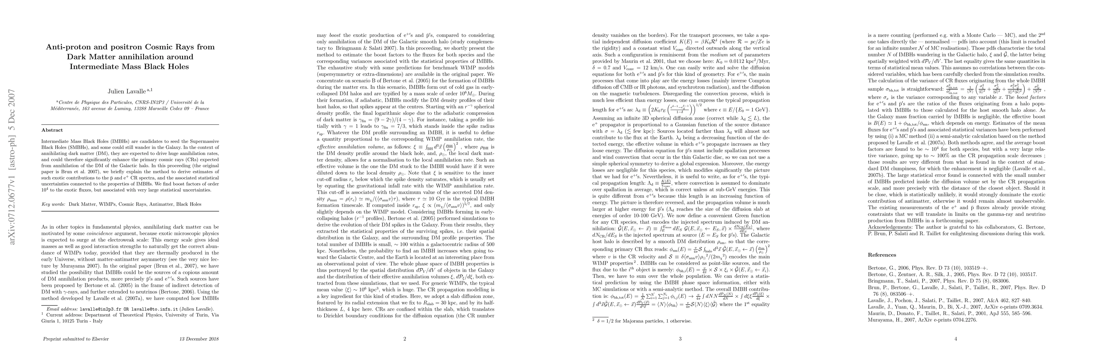 Intermediate Mass Black Holes (IMBHs) are candidates to seed the Supermassive Black Holes (SMBHs), and some could still wander in the Galaxy. In the context of annihilating dark matter (DM), they are expected to drive huge annihilation rates, and could therefore significantly enhance the primary cosmic rays (CRs) expected from annihilation of the DM of the Galactic halo. In this proceeding (the original paper is Brun et al. 2007), we briefly explain the method to derive estimates of such exotic contributions to the anti-proton and positron CR spectra, and the associated statistical uncertainties connected to the properties of IMBHs. We find boost factors of order $10^4$ to the exotic fluxes, but associated with very large statistical uncertainties.