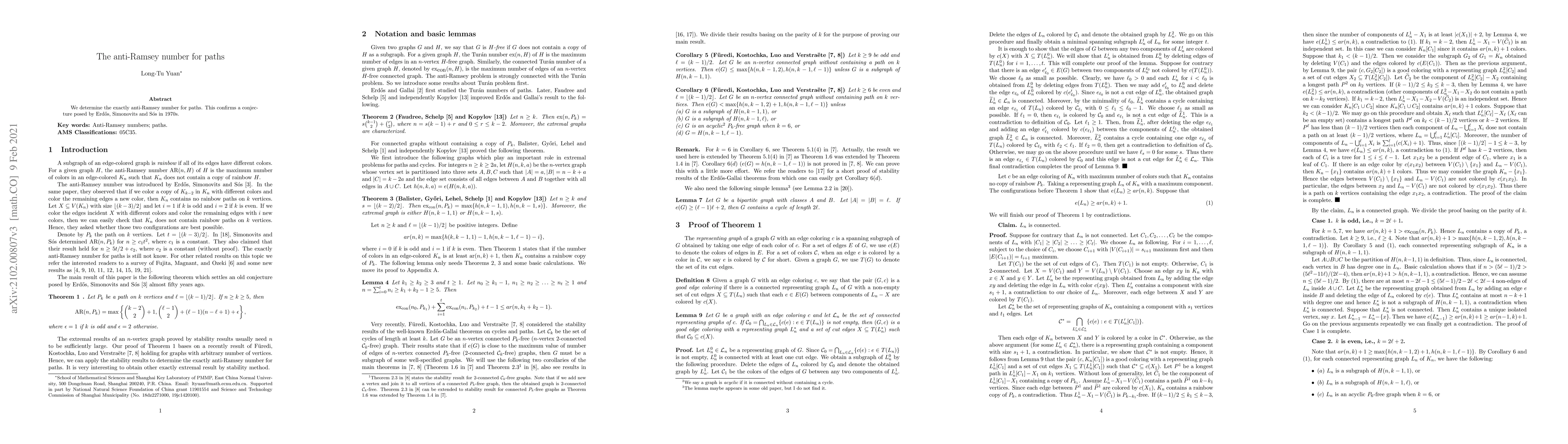 Summary: This paper determines the anti-Ramsey numbers for paths, confirming a long-standing conjecture by Erdős, Simonovits, and Sós from the 1970s. The findings provide a significant advancement in combinatorial graph theory.