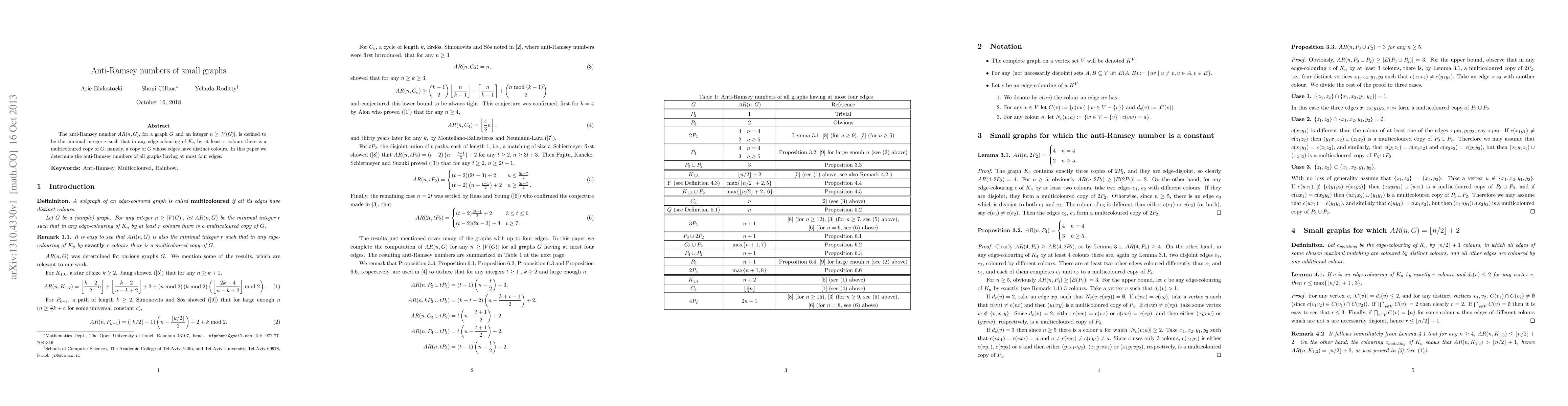 This paper determines the anti-Ramsey numbers for all graphs with up to four edges, defining the minimal number of colors needed in any coloring of $K_n$ to guarantee a multicolored subgraph isomorphic to the given graph $G$.