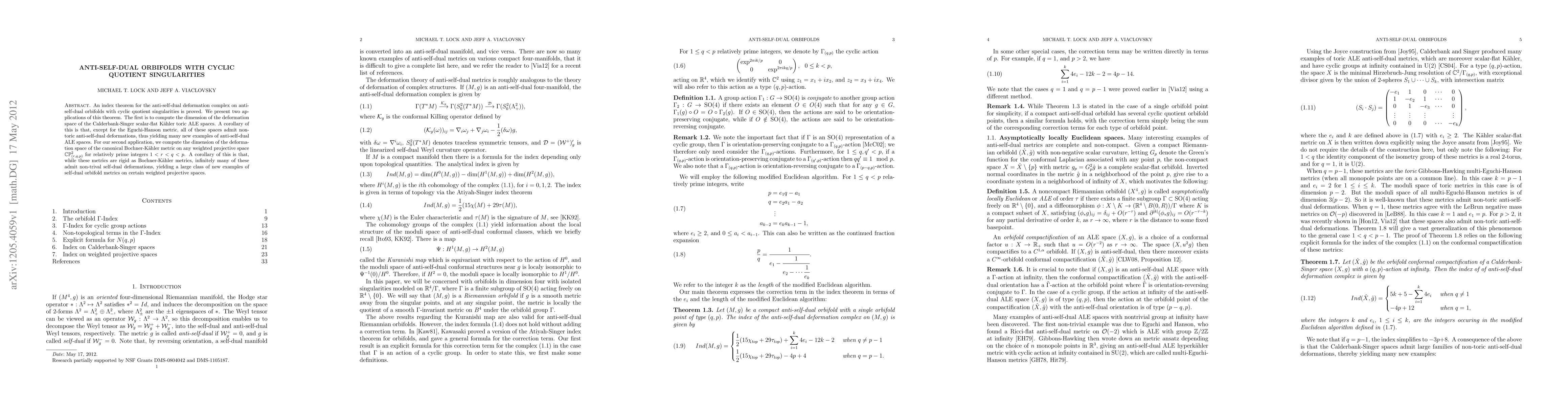 This paper proves an index theorem for anti-self-dual deformations on orbifolds with cyclic singularities, applying it to determine deformation spaces of Calderbank-Singer scalar-flat toric ALE spaces and canonical Bochner-Kahler metrics on weighted projective spaces, revealing numerous new examples of anti-self-dual and self-dual orbifold metrics.