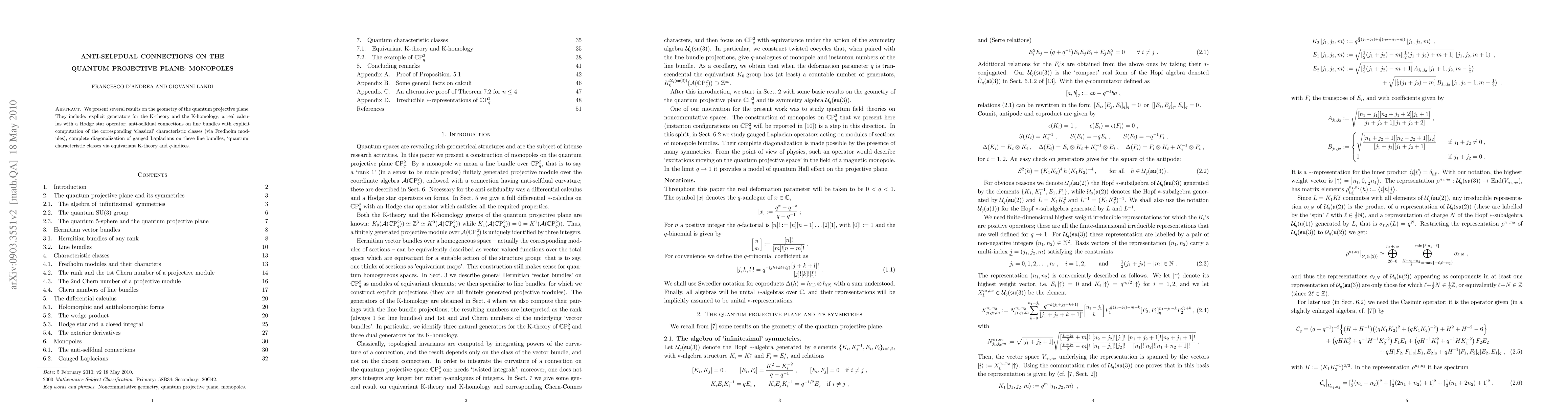 This paper explores the geometry of the quantum projective plane CP2q, detailing explicit generators for K-theory and K-homology, and presenting anti-selfdual connections on line bundles with computed monopoles and instanton charges. It also discusses quantum invariants through equivariant K-theory and q-indices.