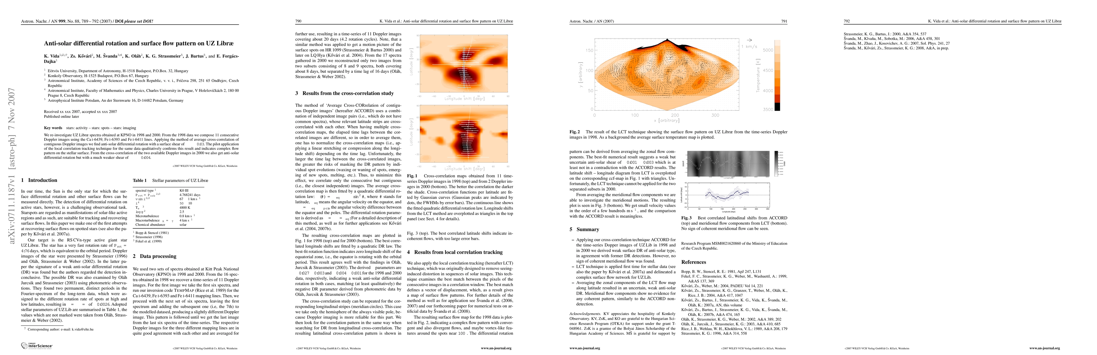 This study re-analyzed UZ Librae spectra from 1998 and 2000, revealing anti-solar differential rotation with a stronger shear in 1998 (alpha ~ -0.03) compared to 2000 (alpha ~ -0.004), and identified complex surface flow patterns using Doppler imaging and local correlation tracking.