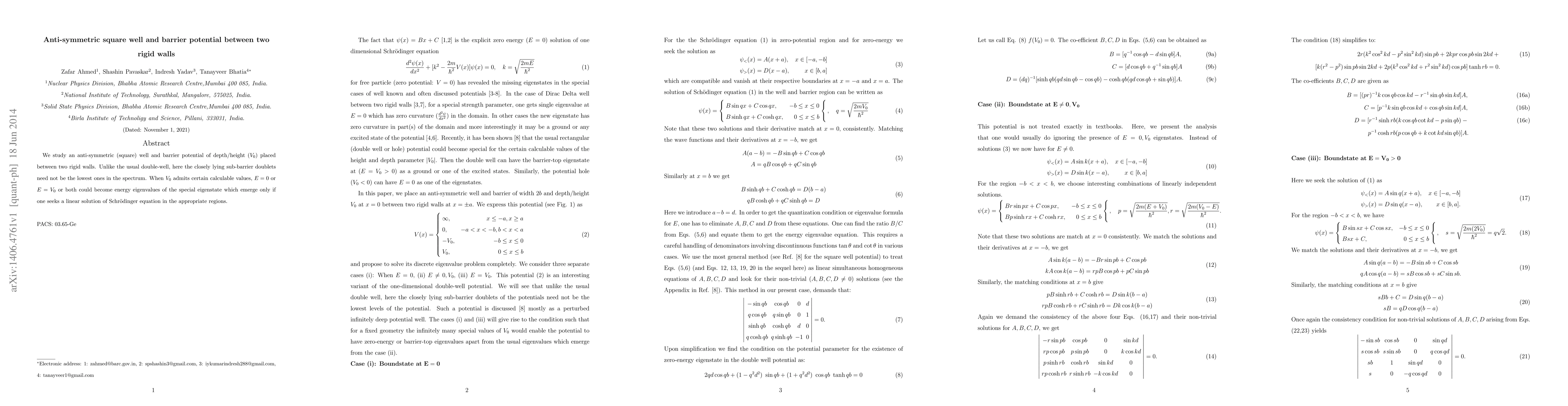 Researchers studied a special type of potential energy well between two rigid walls, finding that certain values of depth/height can lead to unusual energy eigenvalues at $E=0$ or $E=V_0$.