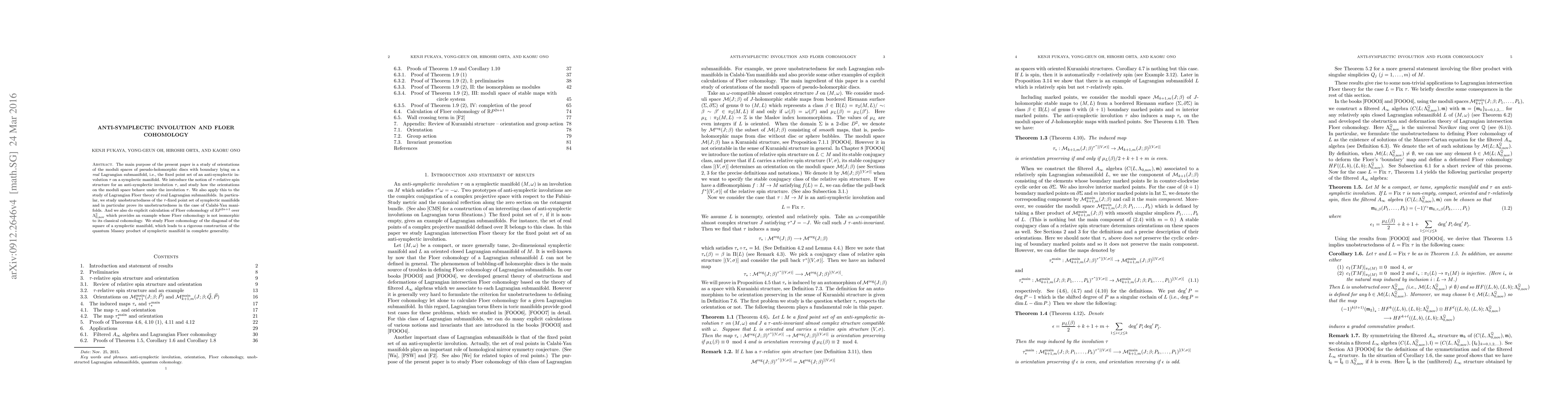 The main purpose of the present paper is a study of orientations of the moduli spaces of pseudo-holomorphic discs with boundary lying on a \emph{real} Lagrangian submanifold, i.e., the fixed point set of an anti-symplectic involutions $\tau$ on a symplectic manifold. We introduce the notion of $\tau$-relatively spin structure for an anti-symplectic involution $\tau$, and study how the orientations on the moduli space behave under the involution $\tau$. We also apply this to the study of Lagrangian Floer theory of real Lagrangian submanifolds. In particular, we study unobstructedness of the $\tau$-fixed point set of symplectic manifolds and in particular prove its unobstructedness in the case of Calabi-Yau manifolds. And we also do explicit calculation of Floer cohomology of $\R P^{2n+1}$ over $\Lambda_{0,nov}^{\Z}$ which provides an example whose Floer cohomology is not isomorphic to its classical cohomology. We study Floer cohomology of the diagonal of the square of a symplectic manifold, which leads to a rigorous construction of the quantum Massey product of symplectic manifold in complete generality.