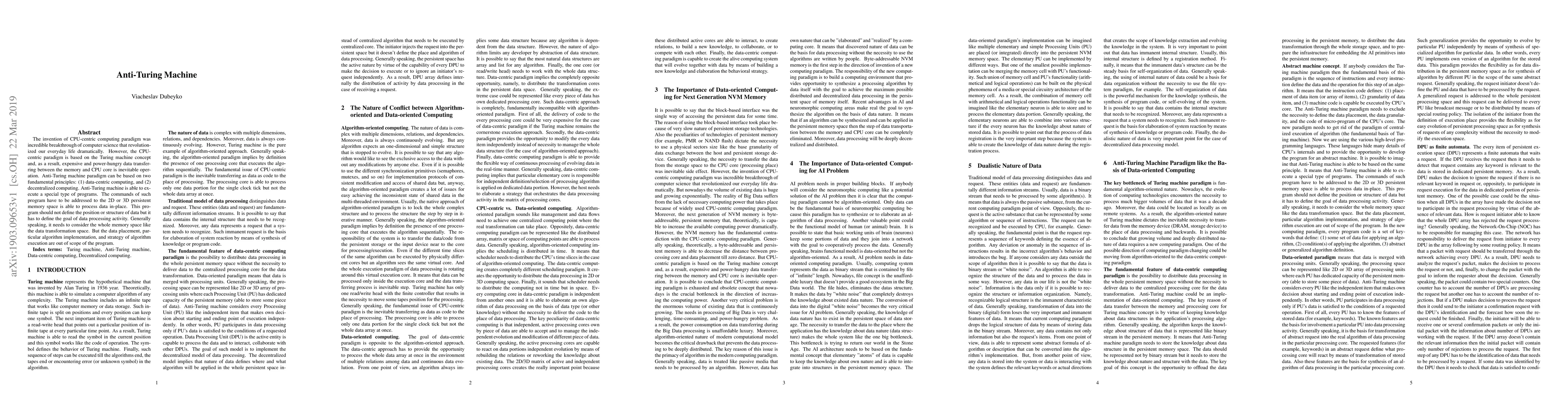 The invention of CPU-centric computing paradigm was incredible breakthrough of computer science that revolutionized our everyday life dramatically. However, the CPU- centric paradigm is based on the Turing machine concept and, as a result, expensive and power-hungry data transferring between the memory and CPU core is inevitable operation. Anti-Turing machine paradigm can be based on two fundamental principles: (1) data-centric computing, and (2) decentralized computing. Anti-Turing machine is able to execute a special type of programs. The commands of such program have to be addressed to the 2D or 3D persistent memory space is able to process data in-place. This program should not define the position or structure of data but it has to define the goal of data processing activity. Generally speaking, it needs to consider the whole memory space like the data transformation space. But the data placement, particular algorithm implementation, and strategy of algorithm execution are out of scope of the program.