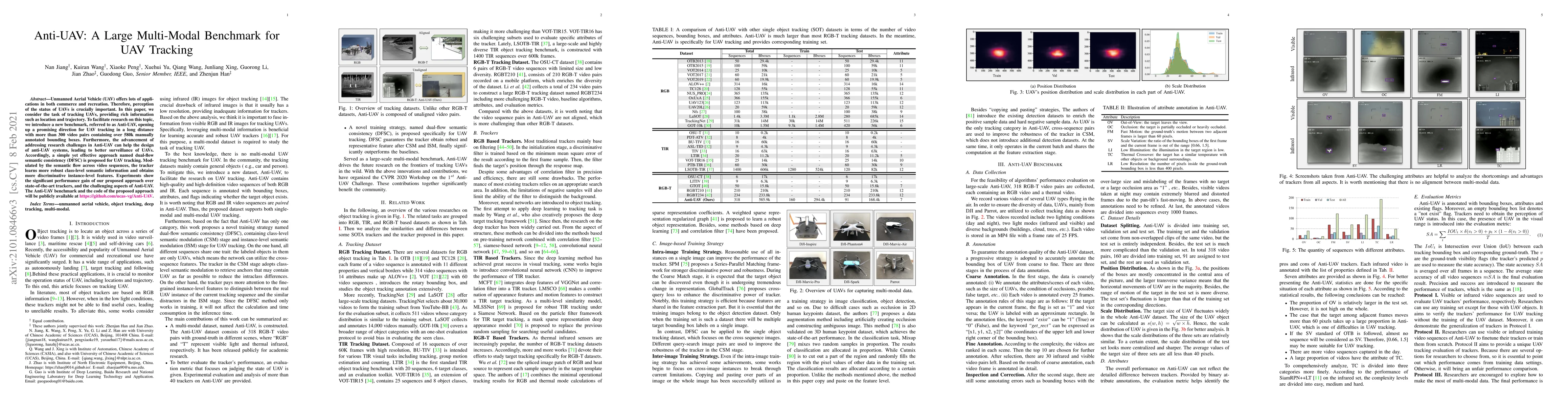 This paper introduces Anti-UAV, a large multi-modal benchmark for UAV tracking, featuring over 300 video pairs with extensive annotations. The authors propose a novel dual-flow semantic consistency approach to enhance UAV tracking, demonstrating improved performance and making the dataset and code publicly available.