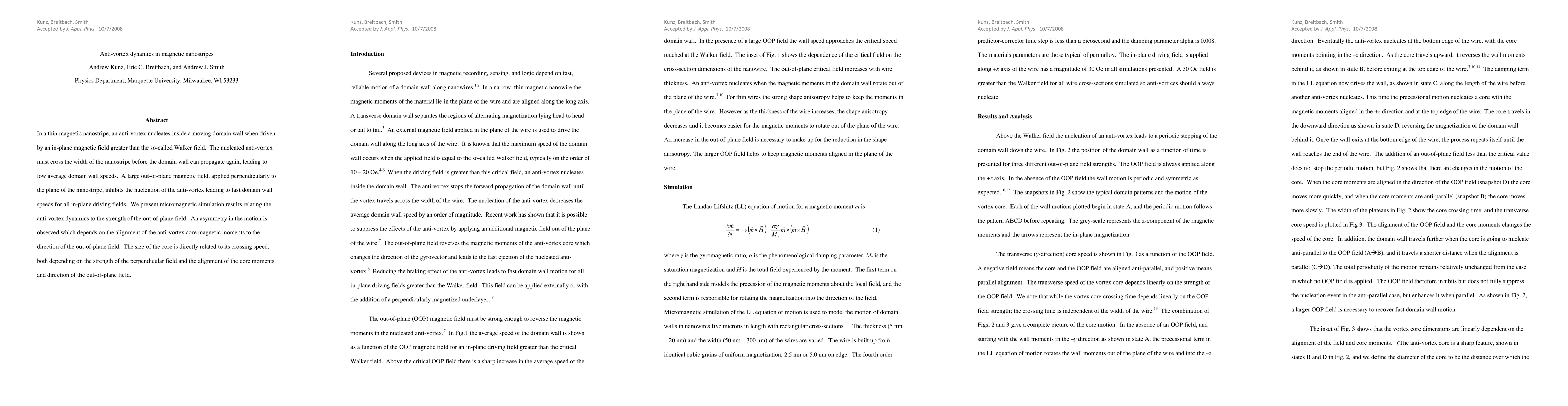 In a thin magnetic nanostripe, an anti-vortex nucleates inside a moving domain wall when driven by an in-plane magnetic field greater than the so-called Walker field. The nucleated anti-vortex must cross the width of the nanostripe before the domain wall can propagate again, leading to low average domain wall speeds. A large out-of-plane magnetic field, applied perpendicularly to the plane of the nanostripe, inhibits the nucleation of the anti-vortex leading to fast domain wall speeds for all in-plane driving fields. We present micromagnetic simulation results relating the anti-vortex dynamics to the strength of the out-of-plane field. An asymmetry in the motion is observed which depends on the alignment of the anti-vortex core magnetic moments to the direction of the out-of-plane field. The size of the core is directly related to its crossing speed, both depending on the strength of the perpendicular field and the alignment of the core moments and direction of the out-of-plane field.