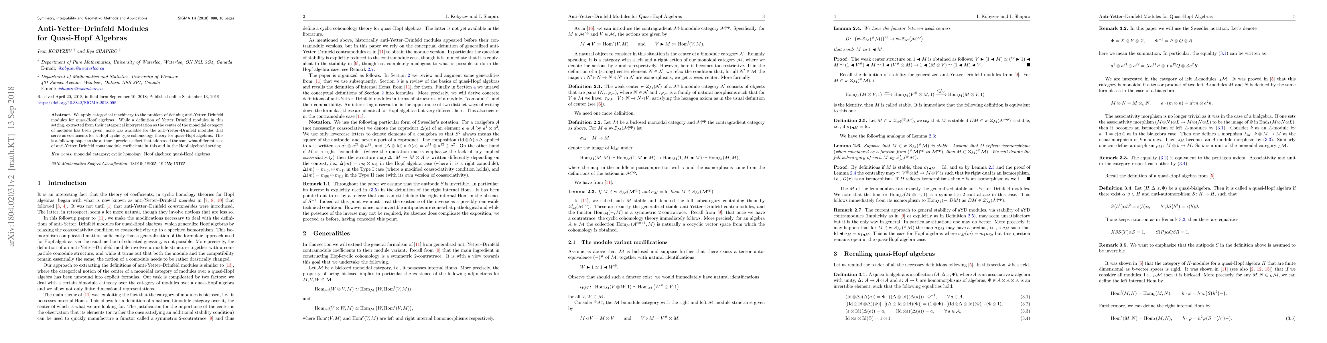 We apply categorical machinery to the problem of defining anti-Yetter-Drinfeld modules for quasi-Hopf algebras. While a definition of Yetter-Drinfeld modules in this setting, extracted from their categorical interpretation as the center of the monoidal category of modules has been given, none was available for the anti-Yetter-Drinfeld modules that serve as coefficients for a Hopf cyclic type cohomology theory for quasi-Hopf algebras. This is a followup paper to the authors' previous effort that addressed the somewhat different case of anti-Yetter-Drinfeld contramodule coefficients in this and in the Hopf algebroid setting.